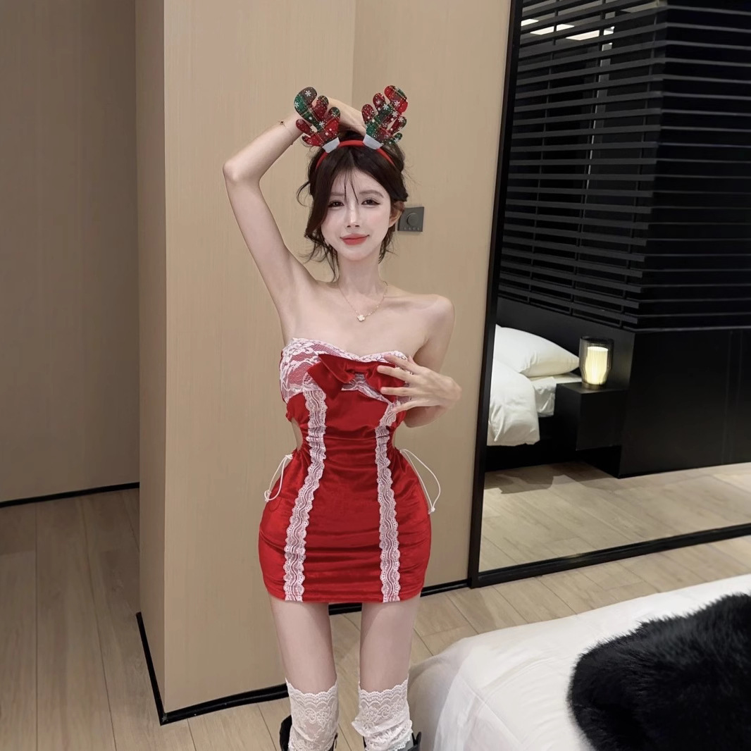 纯欲辣妹性感蕾丝丝绒拼接圣诞设计感抹胸裹胸修身包臀连衣裙