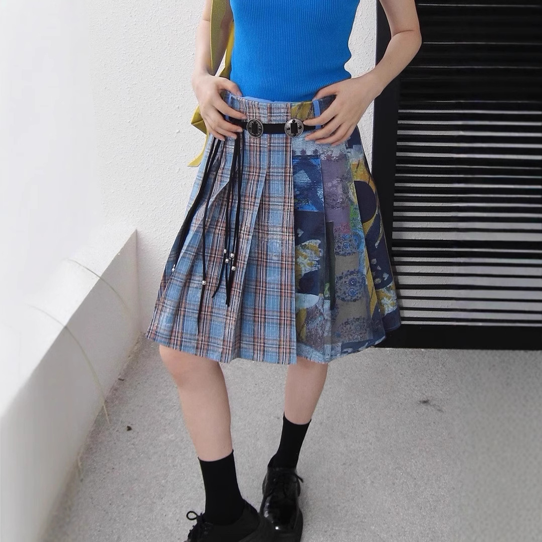 「克罗地亚海风」棉质复古印花格纹压褶半身裙女夏季气质新款