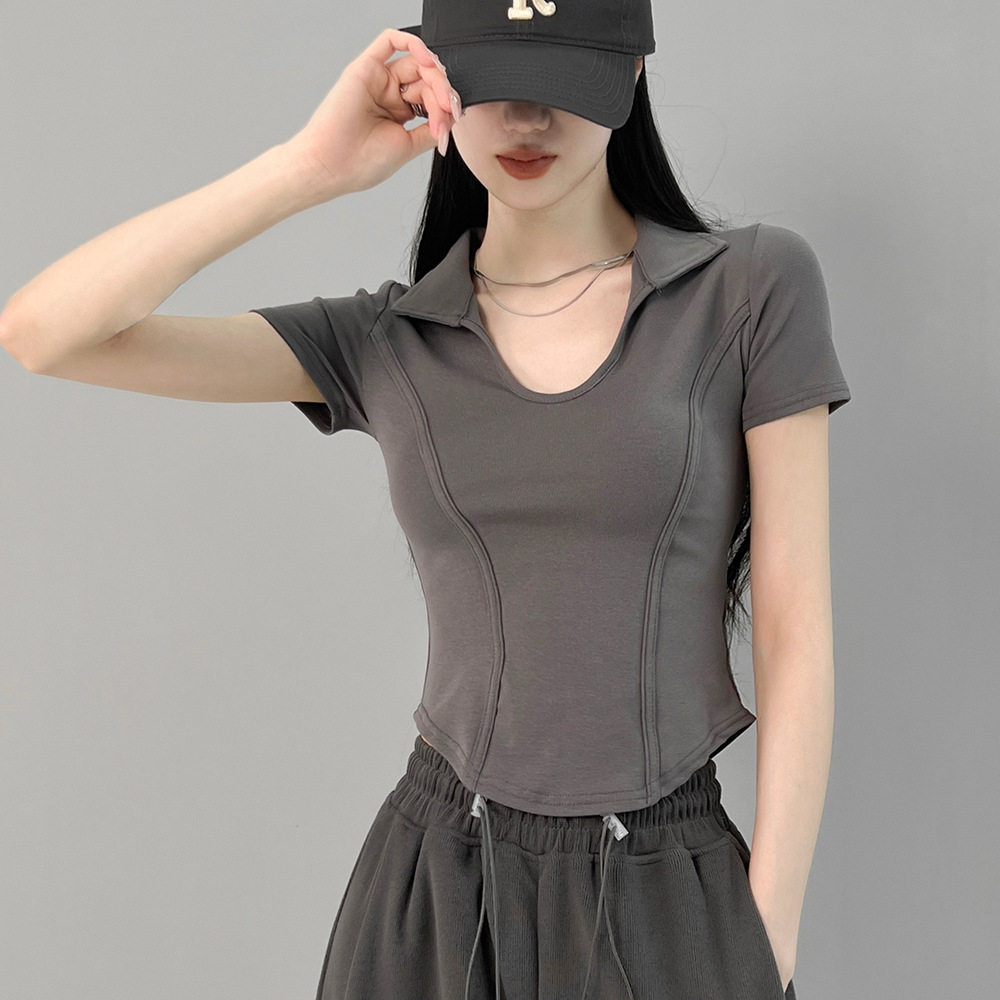 美式复古u领鱼骨正肩短袖t恤女夏季短款修身不规则polo领辣妹上衣