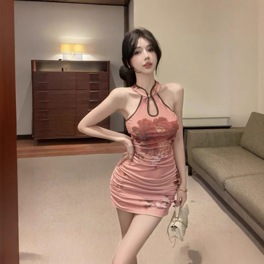 设计感镂空辣妹无袖紧身包臀短裙印花旗袍式粉色纯欲国风连衣裙女