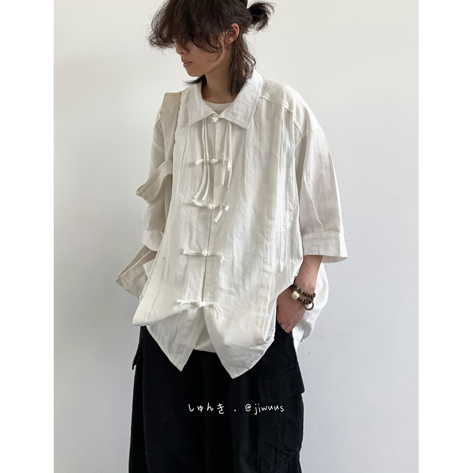 新中式复古唐装纯色衬衣男夏季新款宽松盘扣短袖国风衬衣潮流上衣