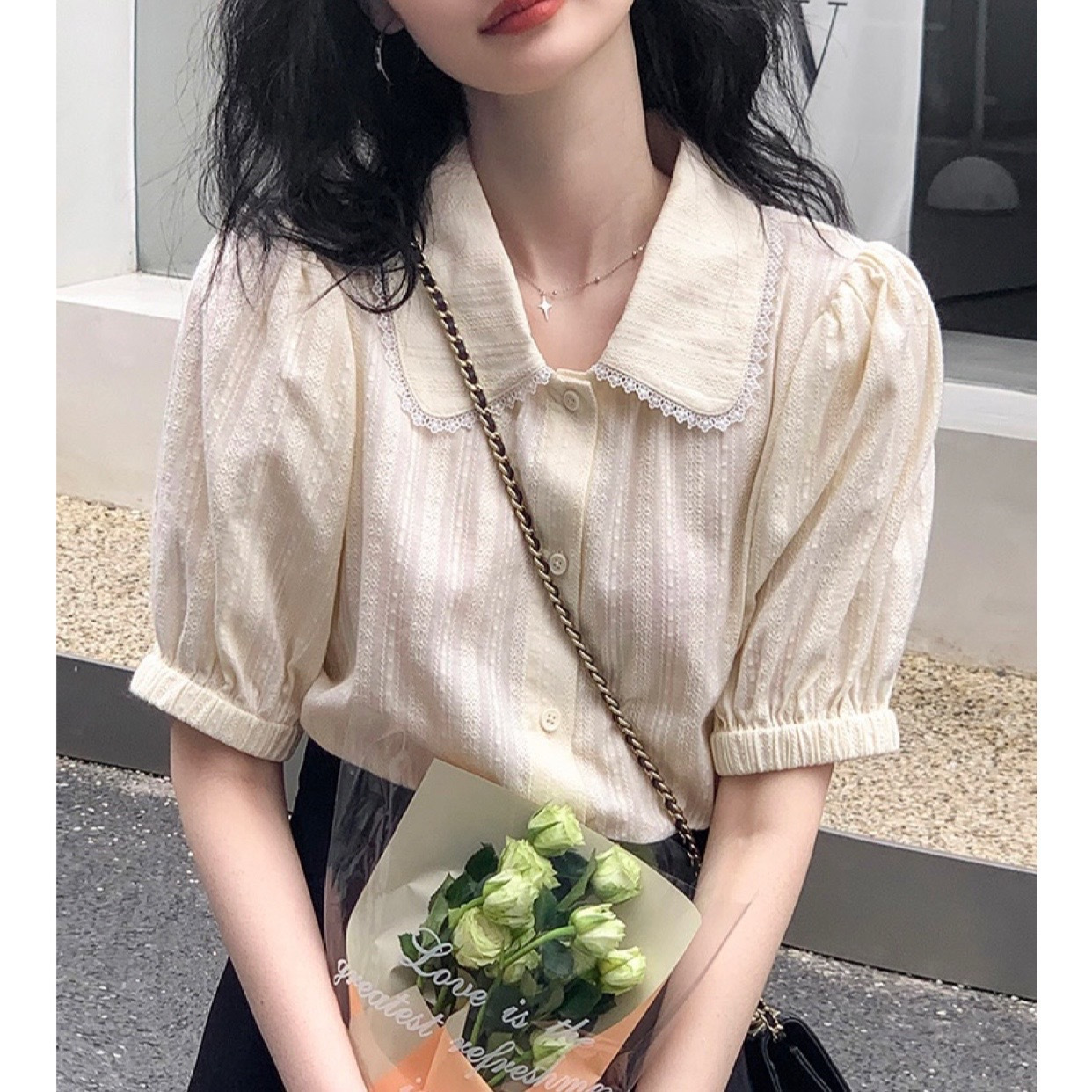 娃娃领法式泡泡袖短袖衬衫女夏季减龄甜美显瘦复古小众衬衣上衣