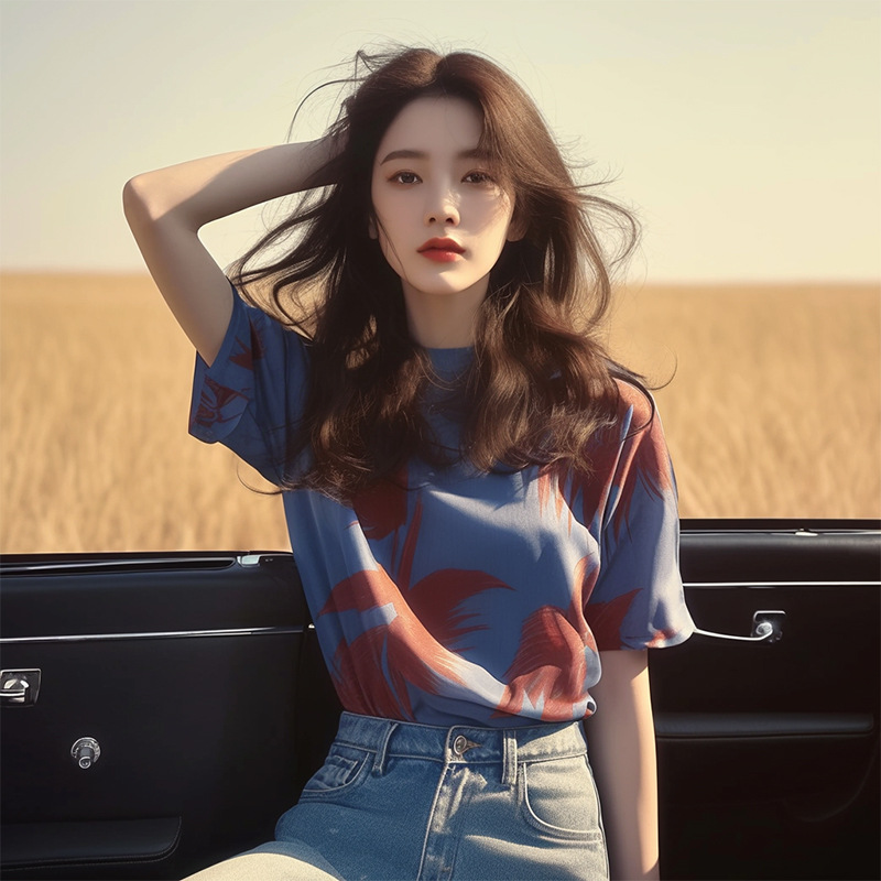 夏季韩系chic洋气减龄独特别致漂亮上衣时尚休闲蓝色印花短袖T恤