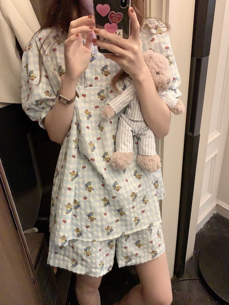 睡衣女夏季短袖短裤新款休闲卡通爱心小熊家居服网红两件套