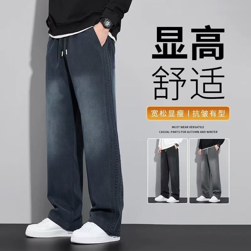 男士牛仔裤秋冬2025新款冬季加绒加厚秋春直筒复古松紧腰阔腿裤子