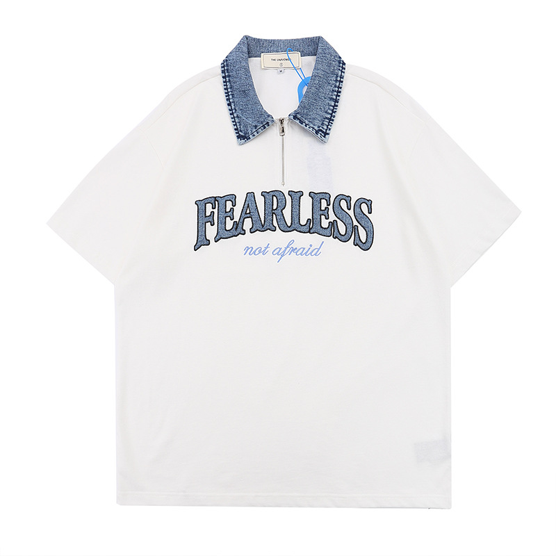 字母贴布短袖T恤男ins高街潮牌拼色翻领半袖体恤宽松半开领Polo衫