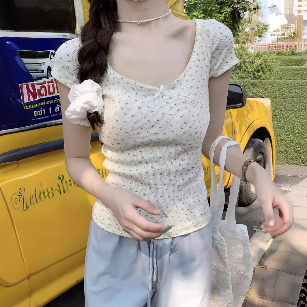 韩系减龄chic碎花U领短袖女夏季新款蝴蝶结纯欲风正肩T恤上衣