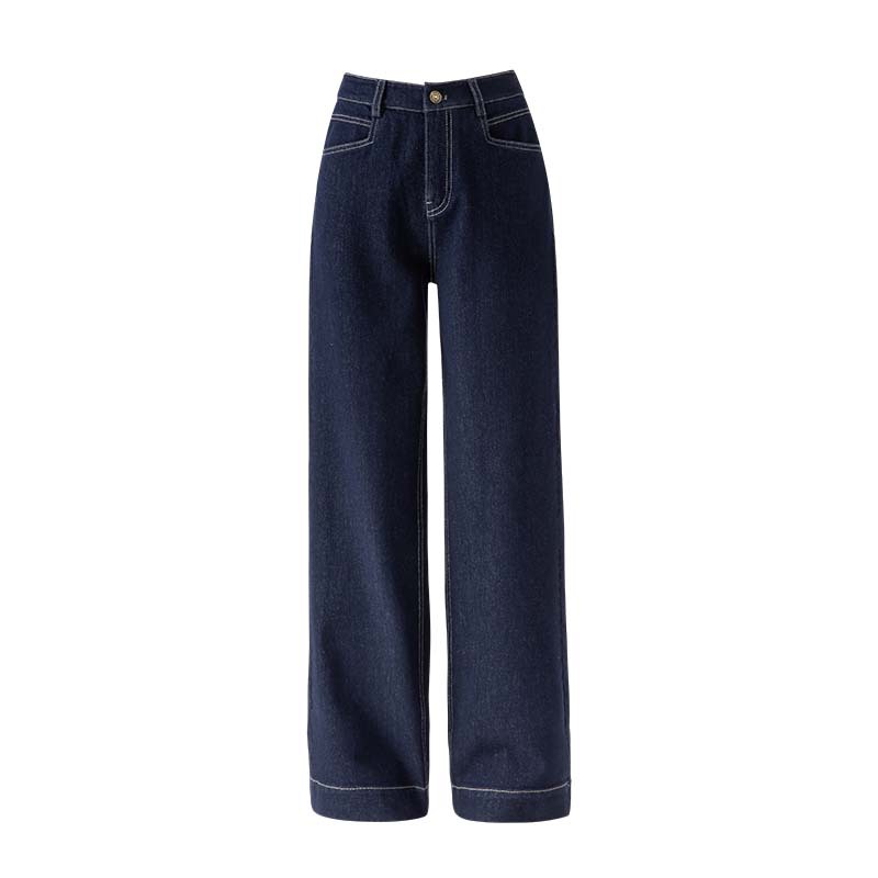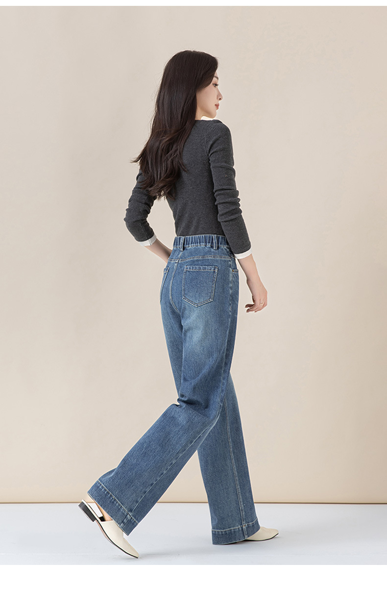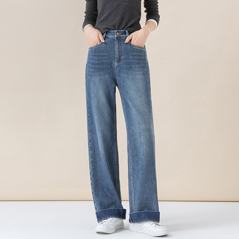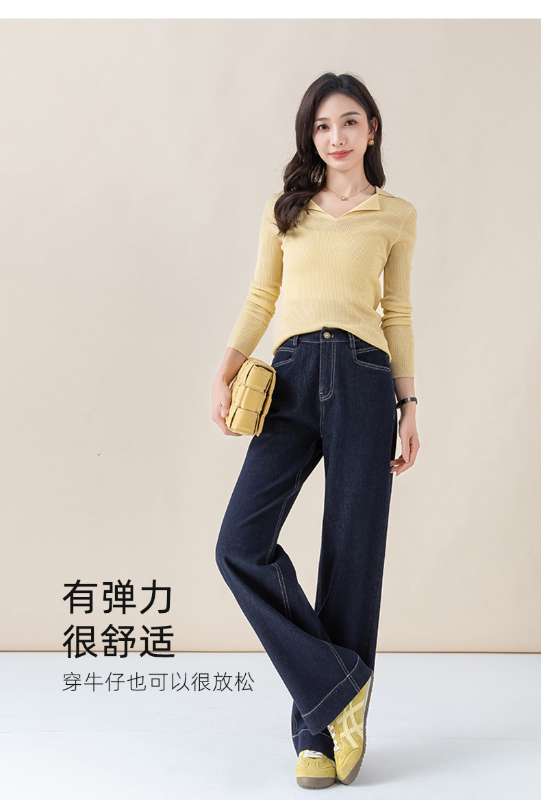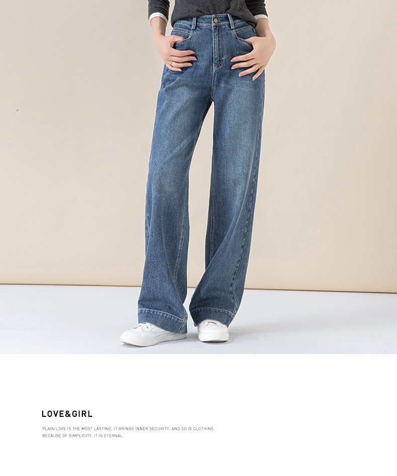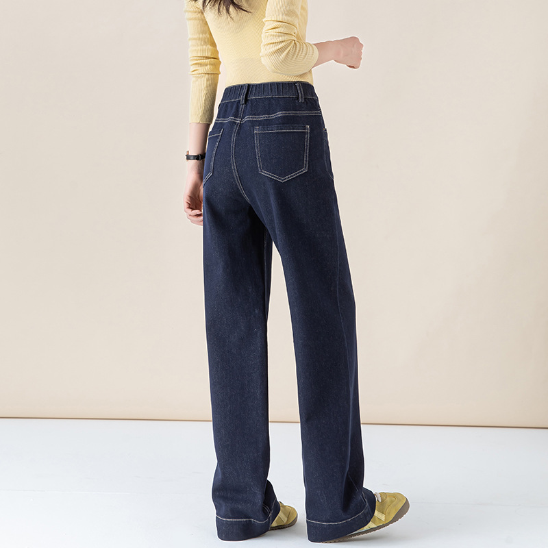 秋季新款丹宁蓝防褪色宽松垂感窄版阔腿裤女小个子直筒牛仔裤