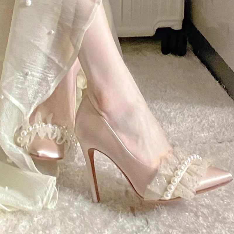 蕾丝花边珍珠高跟鞋尖头浅口珍珠礼服高跟鞋蕾丝婚纱婚鞋