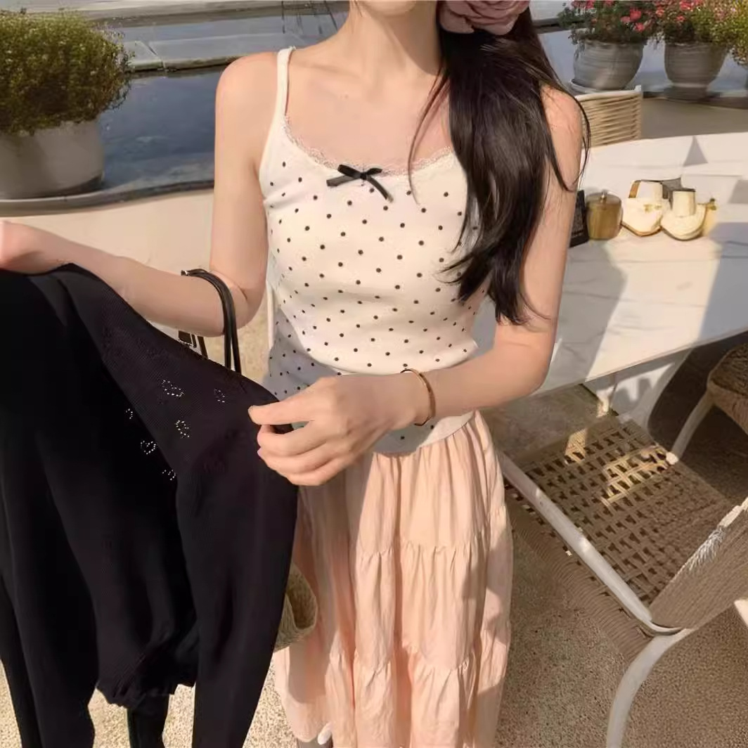 设计感蕾丝边波点小背心美背带胸垫夏季修身蝴蝶结短款吊带上衣女