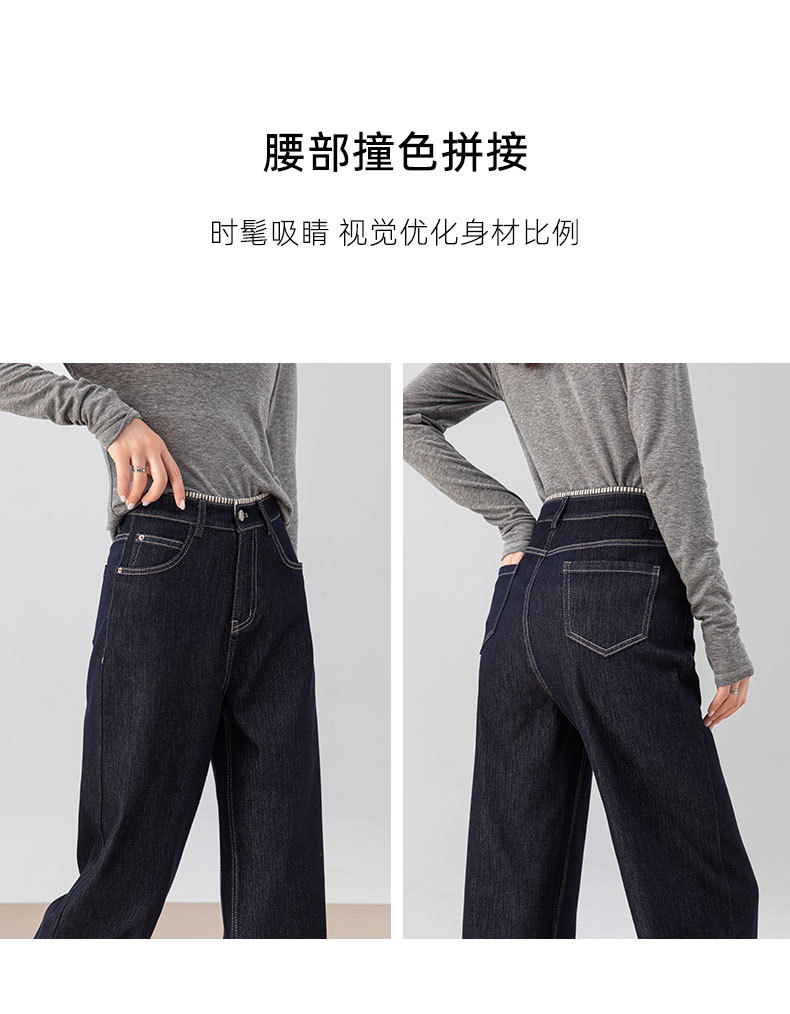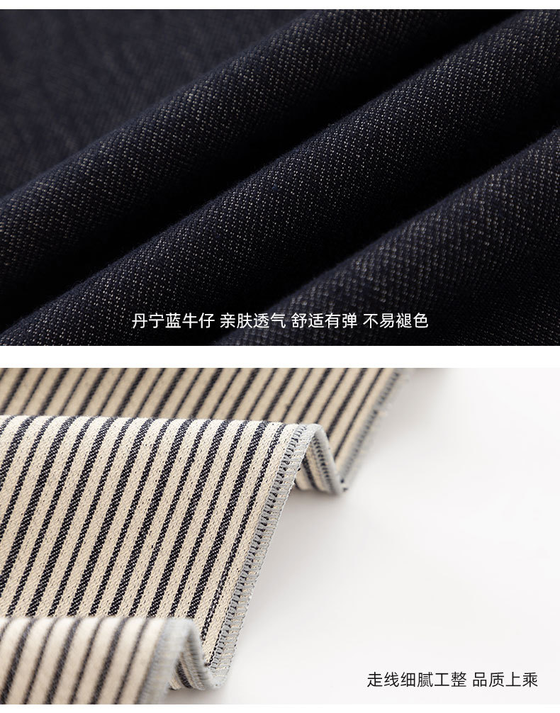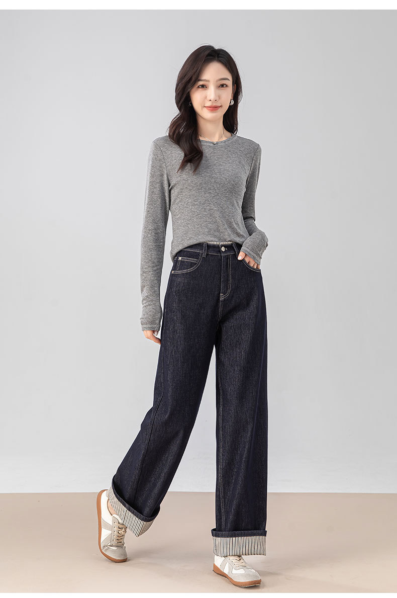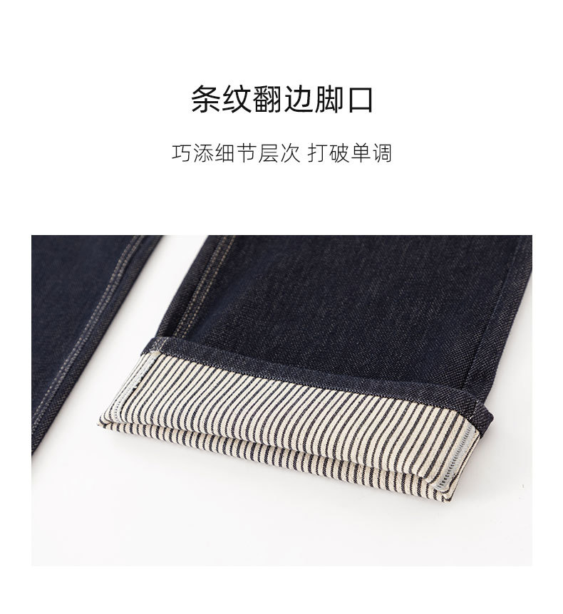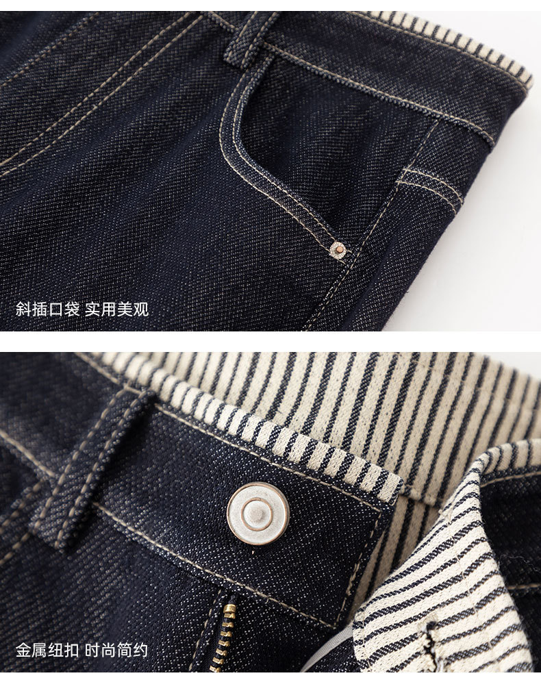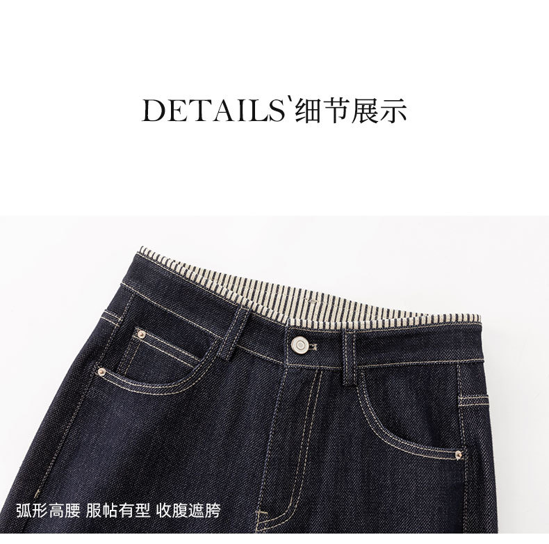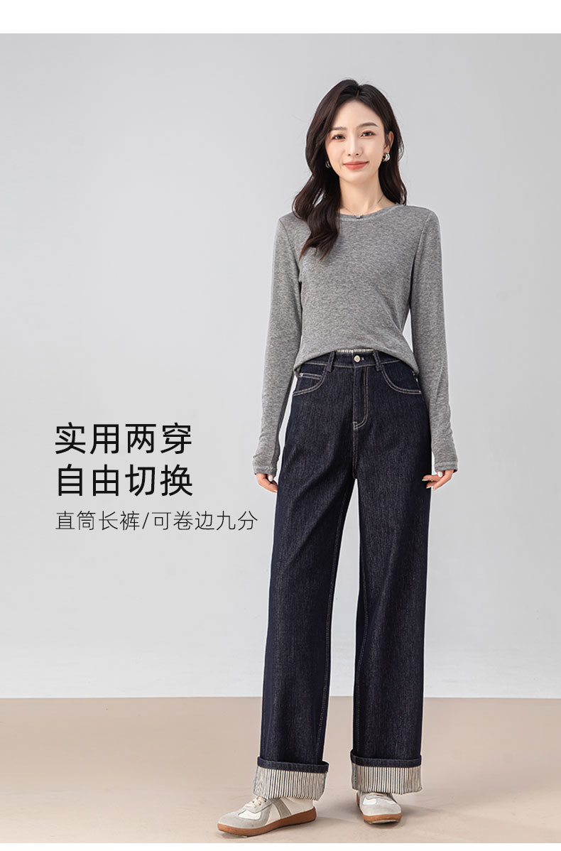 2025经典条纹翻边高腰直筒阔腿裤九分牛仔裤女两穿拖地裤子