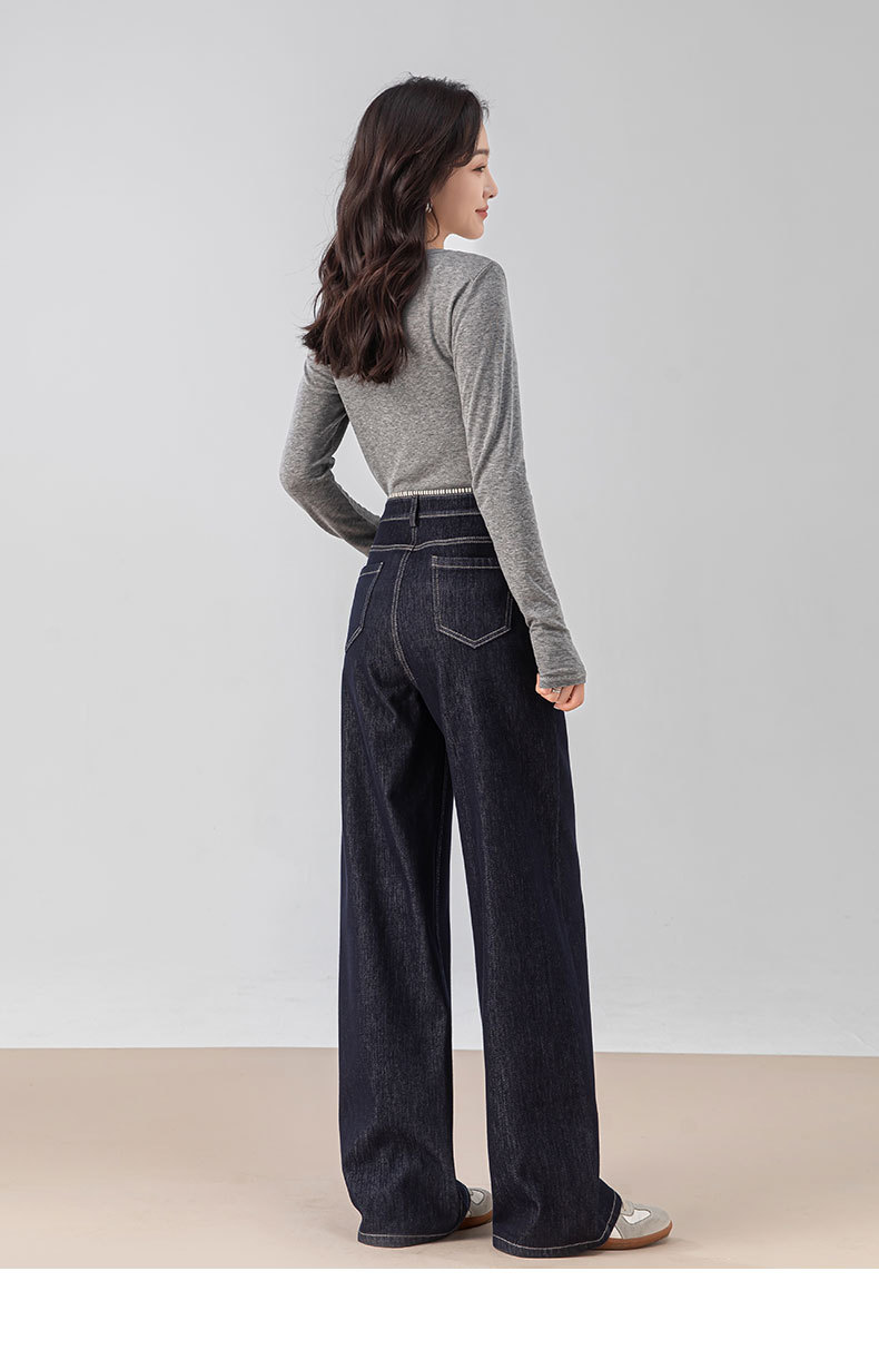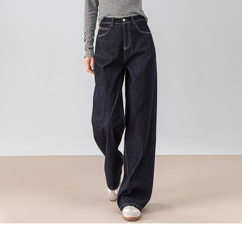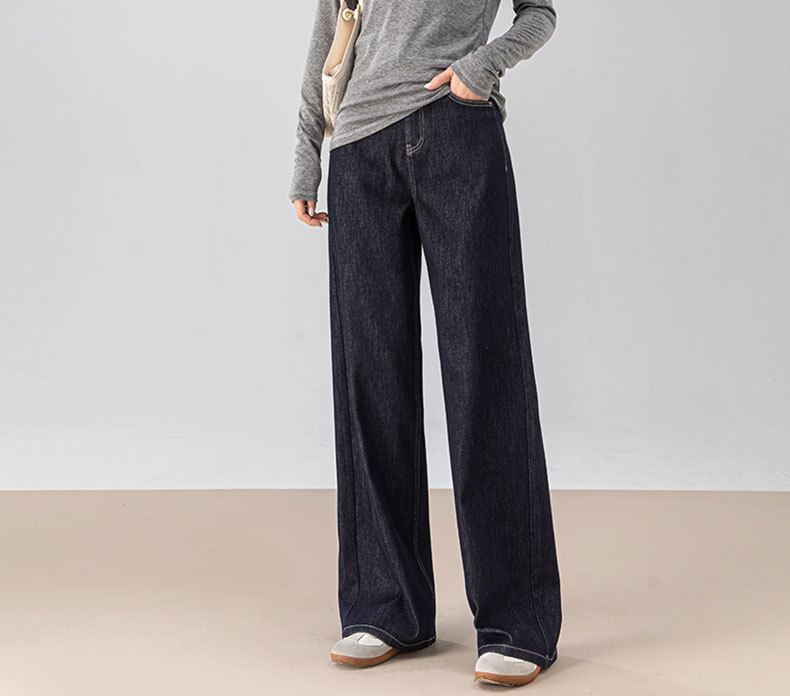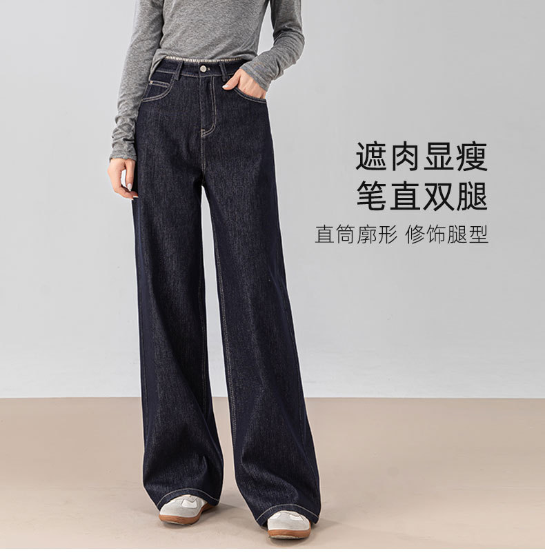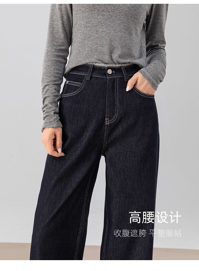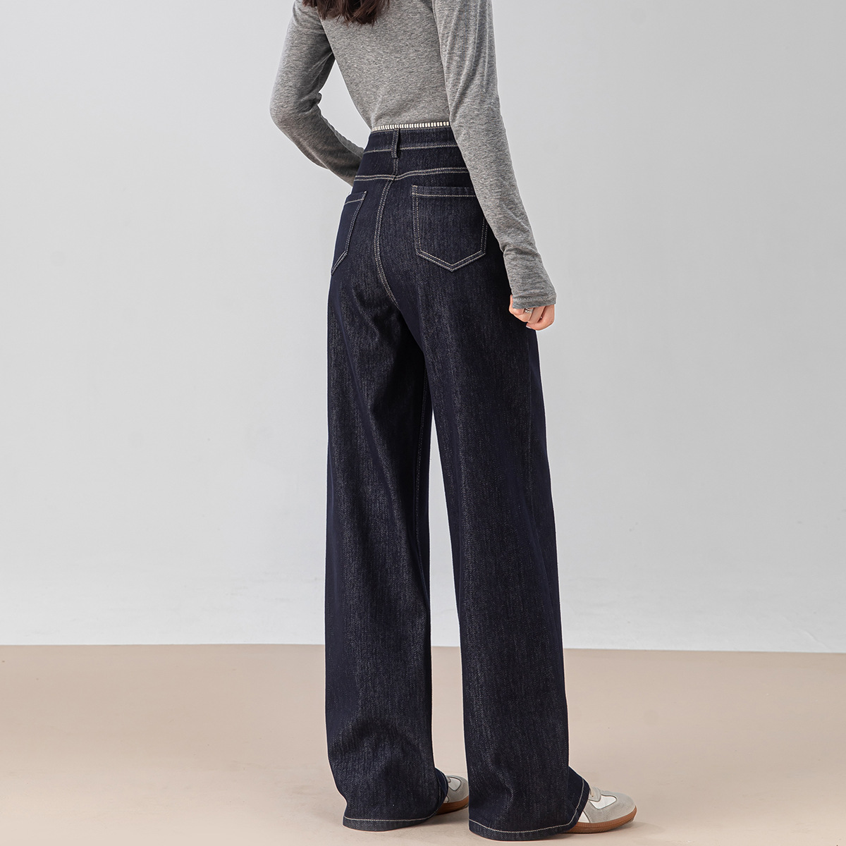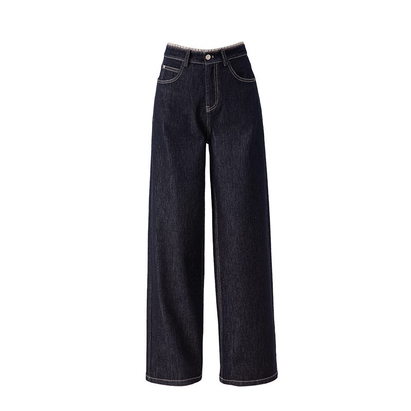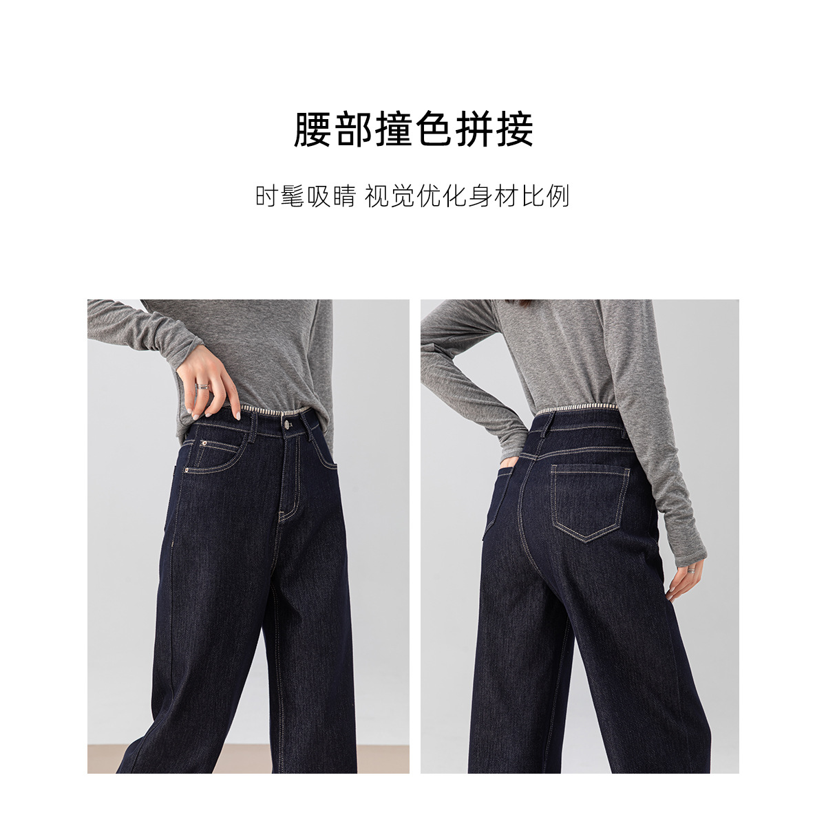 2025经典条纹翻边高腰直筒阔腿裤九分牛仔裤女两穿拖地裤子