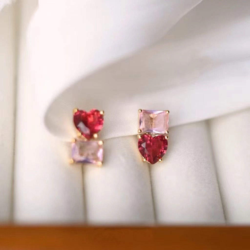 不对称红色甜美爱心耳夹无耳洞女蚊香盘粉色耳饰法式锆石无痛耳钉