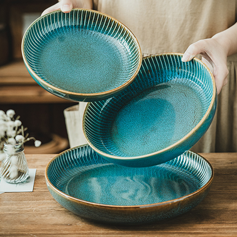 复古蓝色大碗浮雕纹浅碗家用陶瓷碗圆形大盘餐具碗盘批发菜盘菜碗