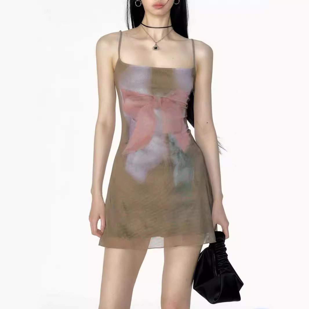 夏季复古修身显瘦性感辣妹收腰网纱印花包臀连衣裙长裙女