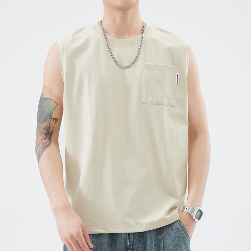 重磅口袋无袖T恤夏季新款男款简约背心潮流时尚百搭上衣白色