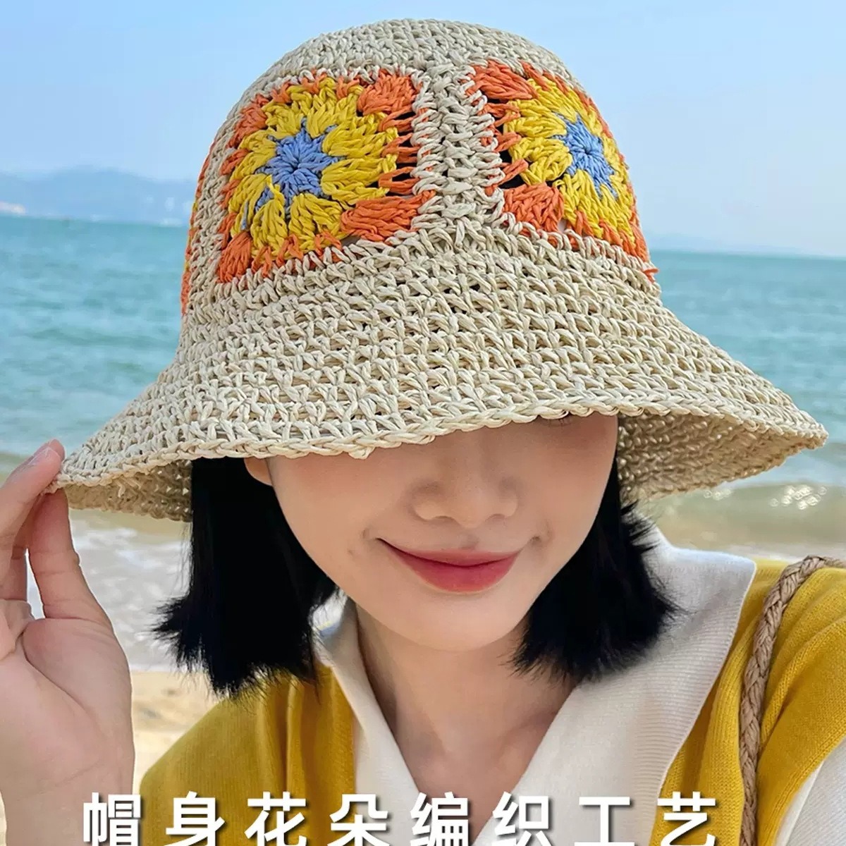 草帽女夏防晒遮阳帽子海边度假沙滩帽草编渔夫帽可折叠太阳帽盆帽