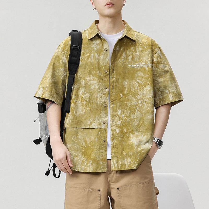 夏季薄款新款日系复古工装短袖衬衫男印花宽松休闲夏威夷半袖衬衣