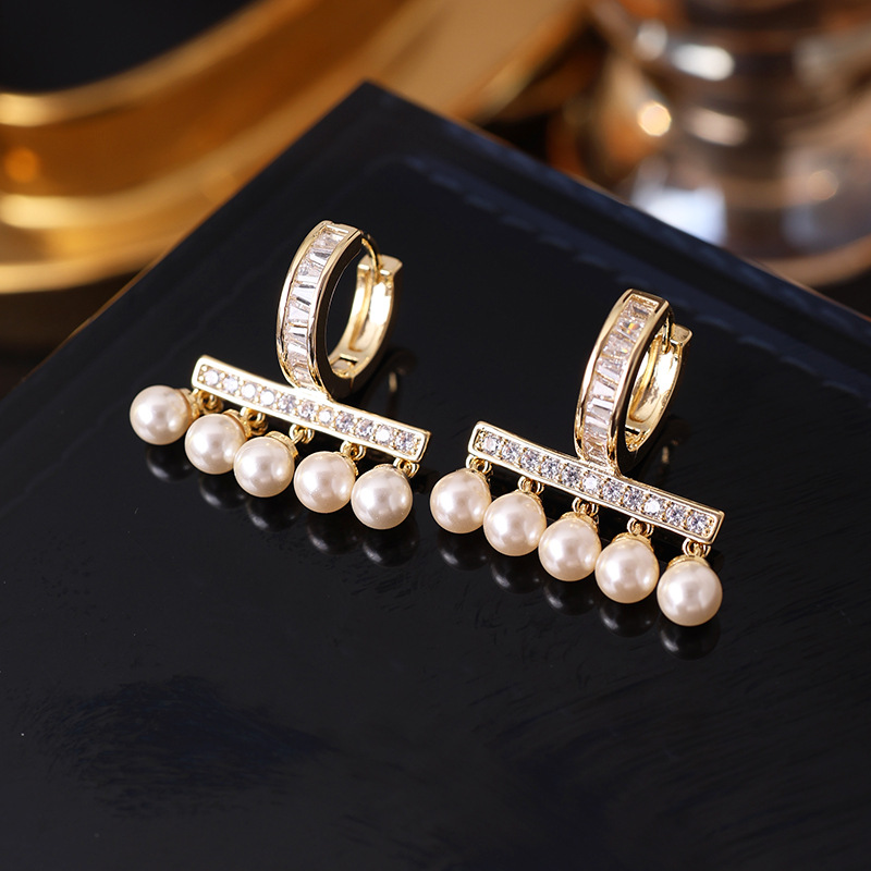艾莉森时尚韩版设计款镶钻一字珍珠流苏耳坠耳扣气质耳环配饰女