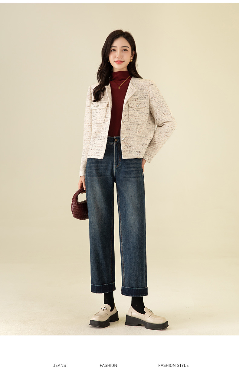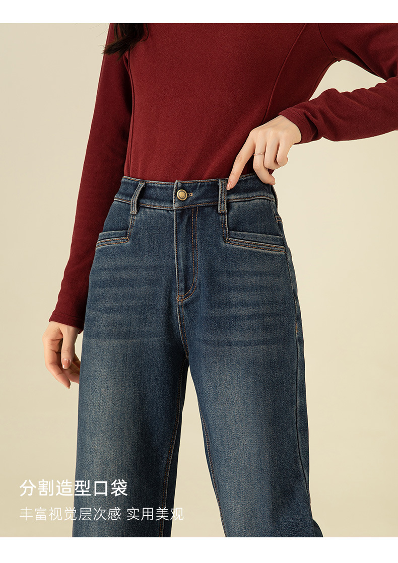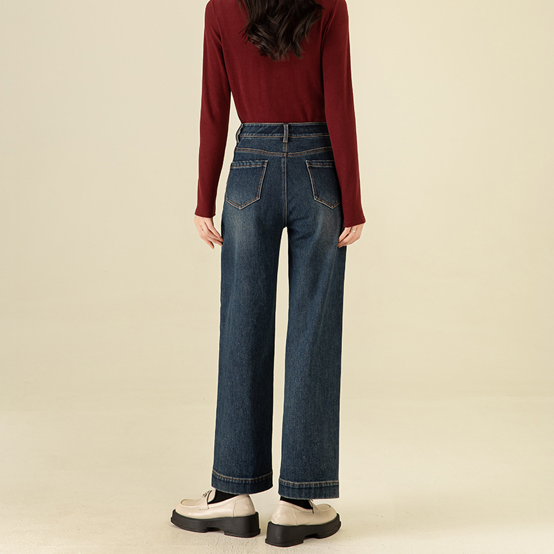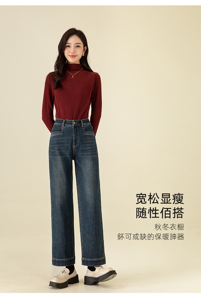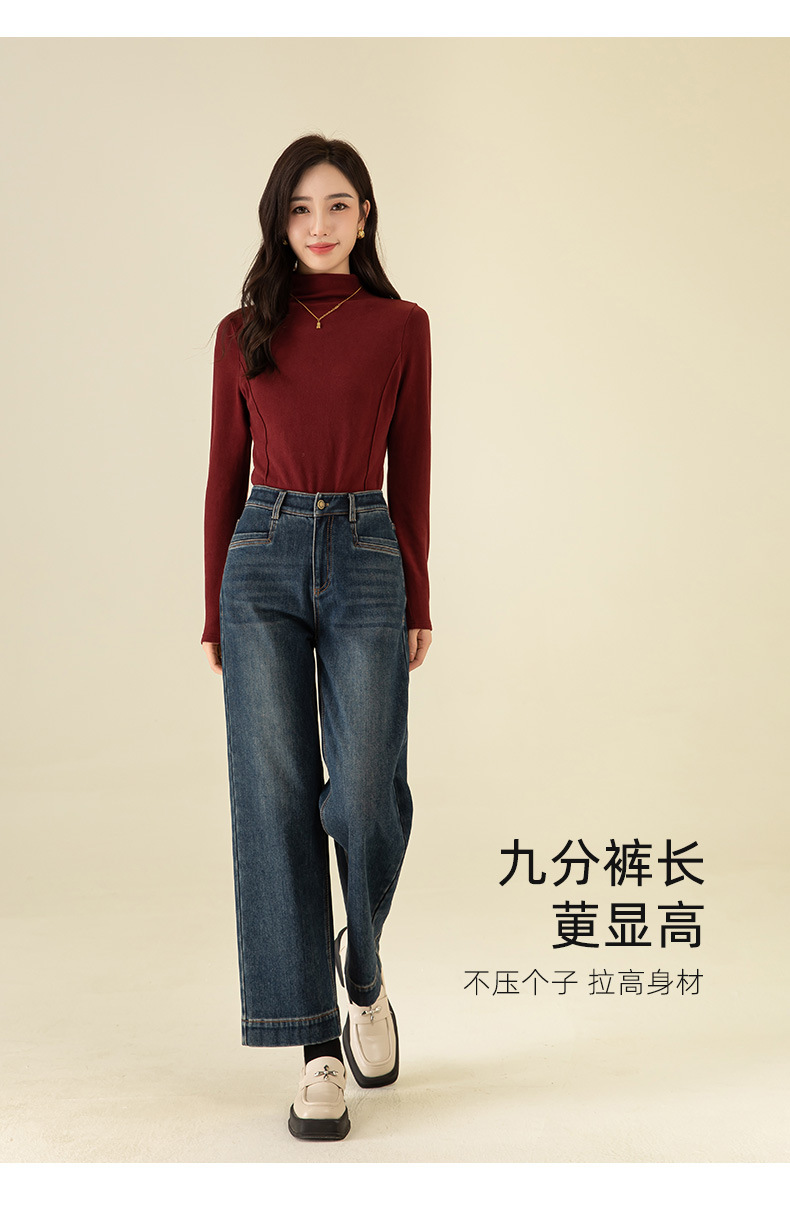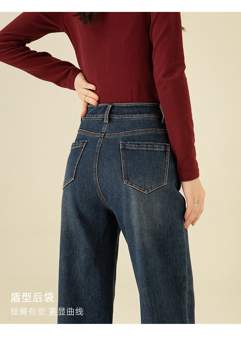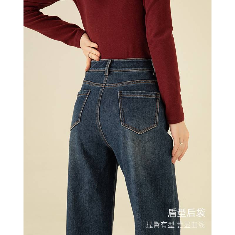 加绒复古九分牛仔裤女冬季新款高腰弹力显瘦窄版宽松阔腿裤