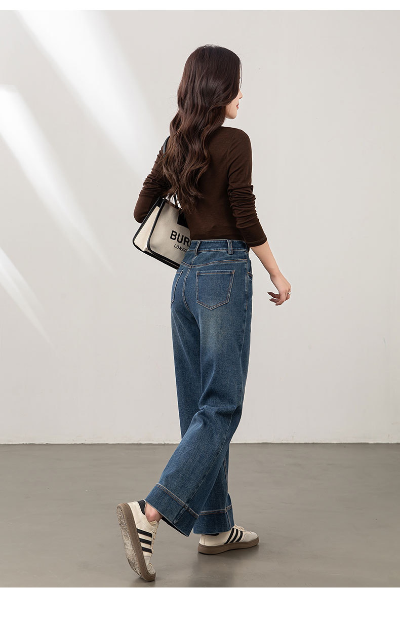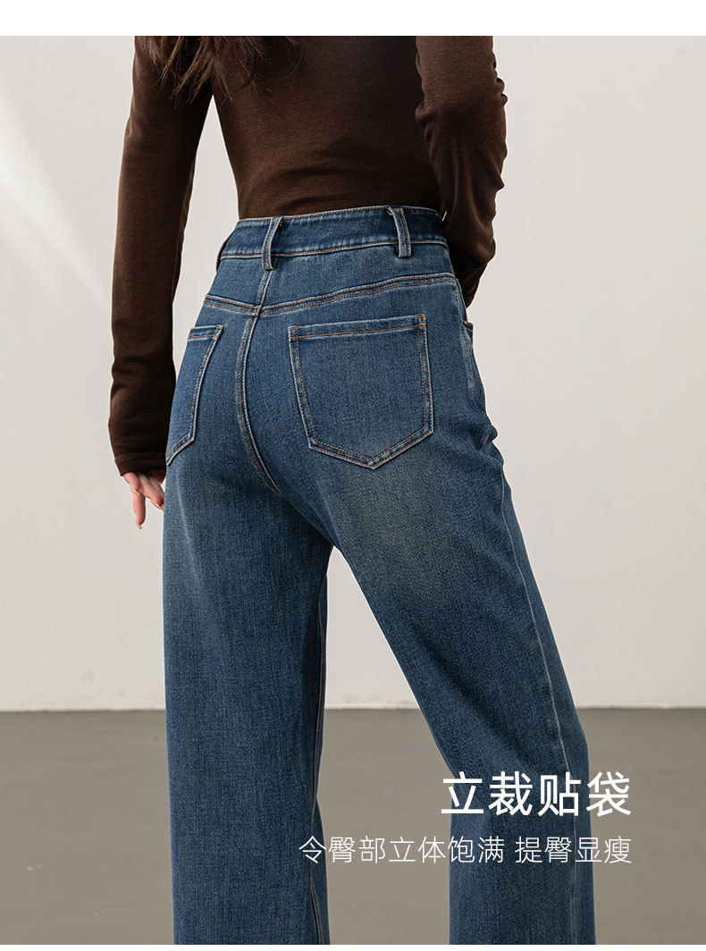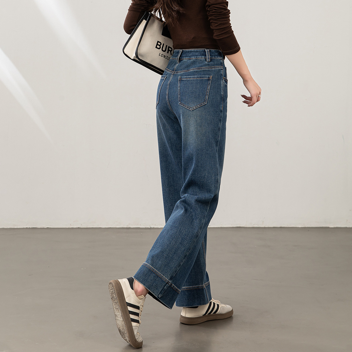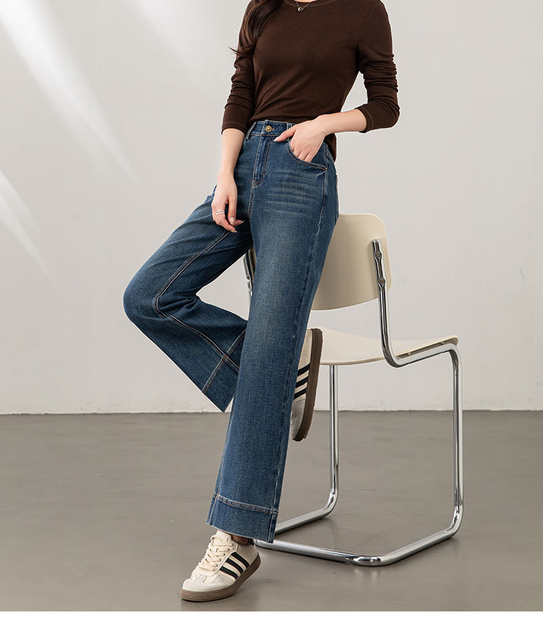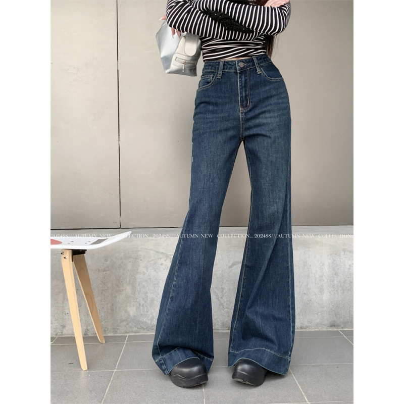 新款复古水洗高腰弹力直筒微喇叭牛仔阔腿拖地长裤女