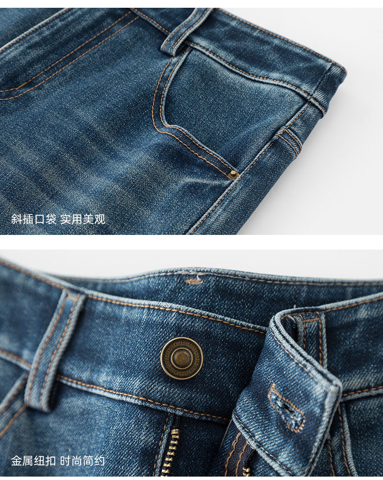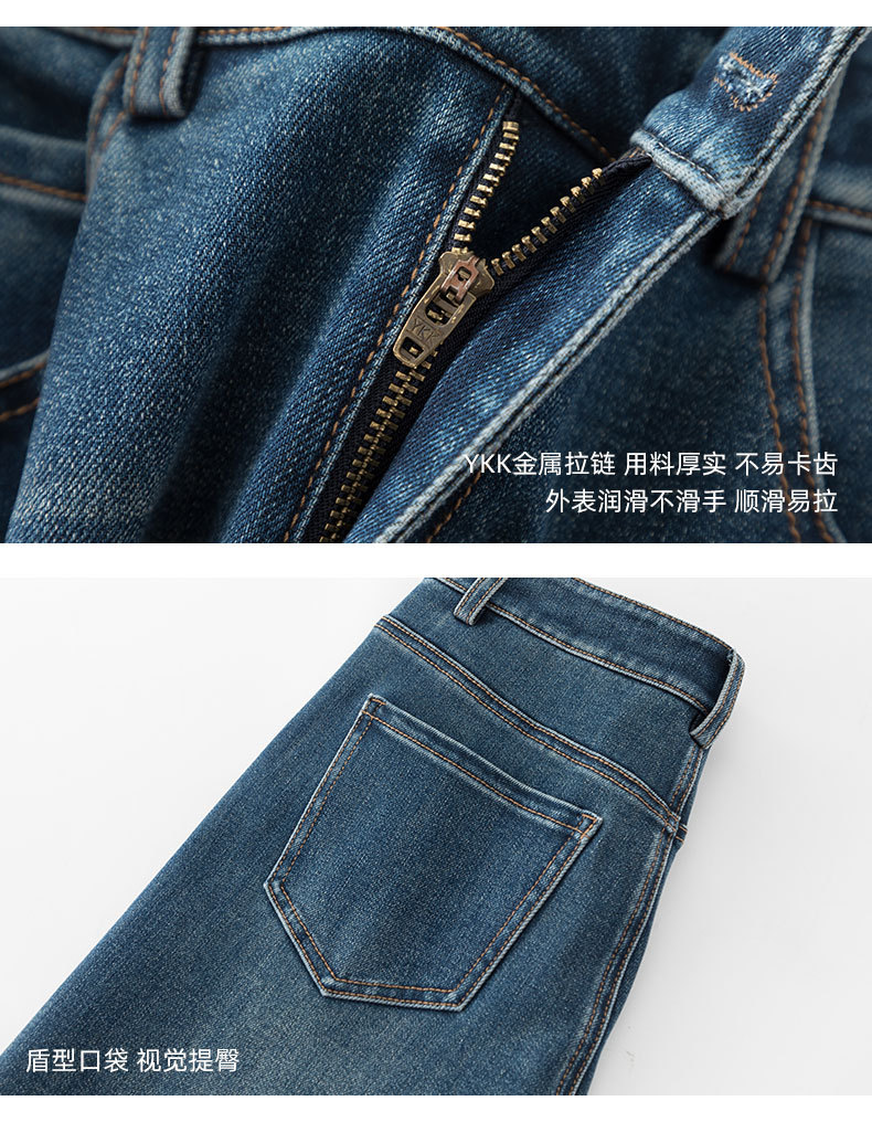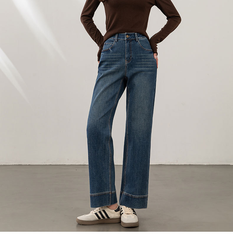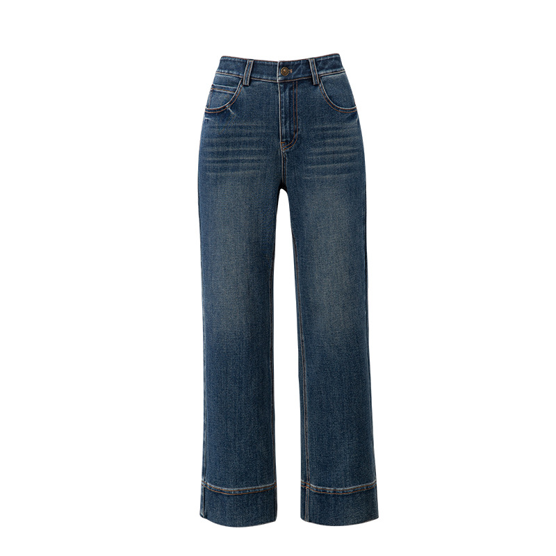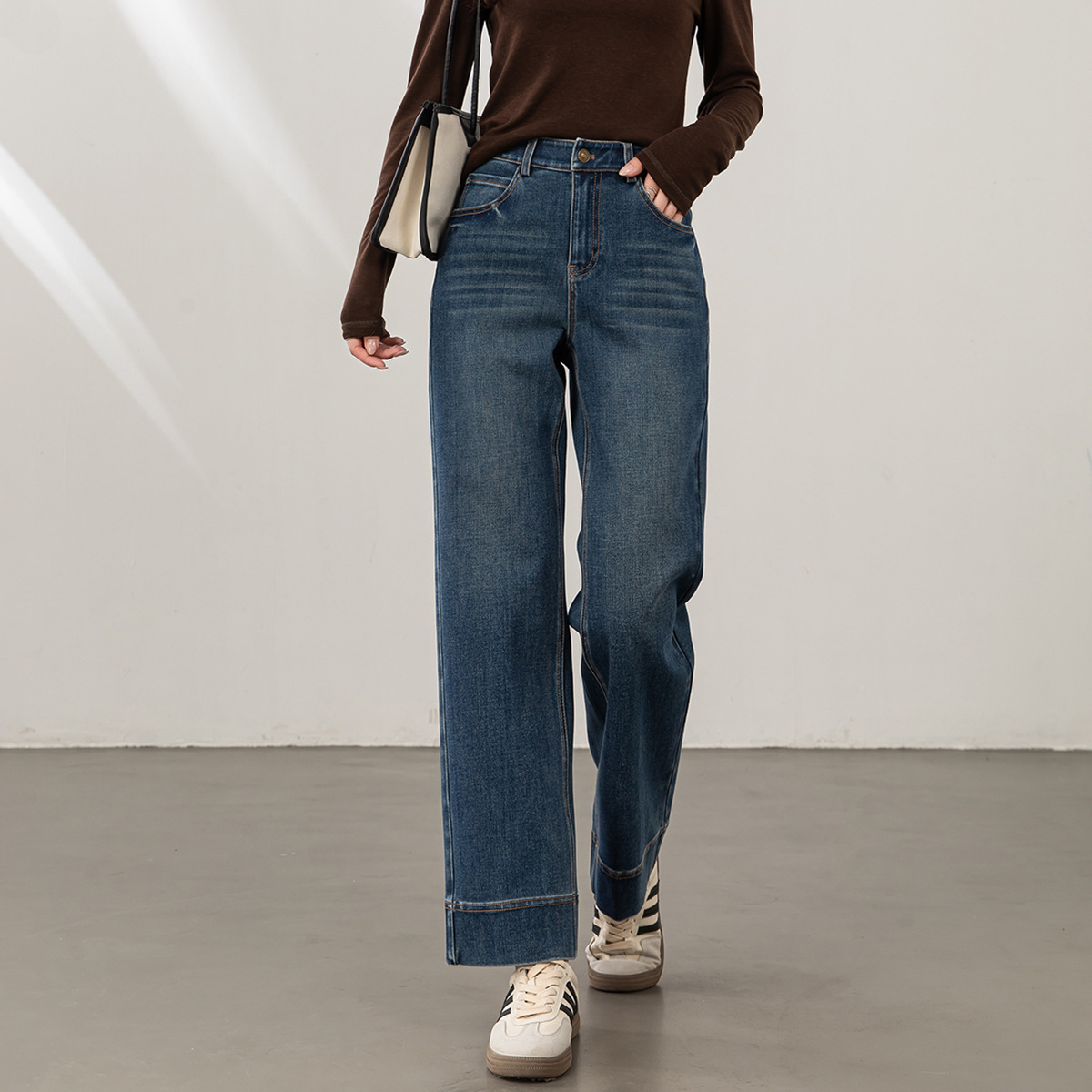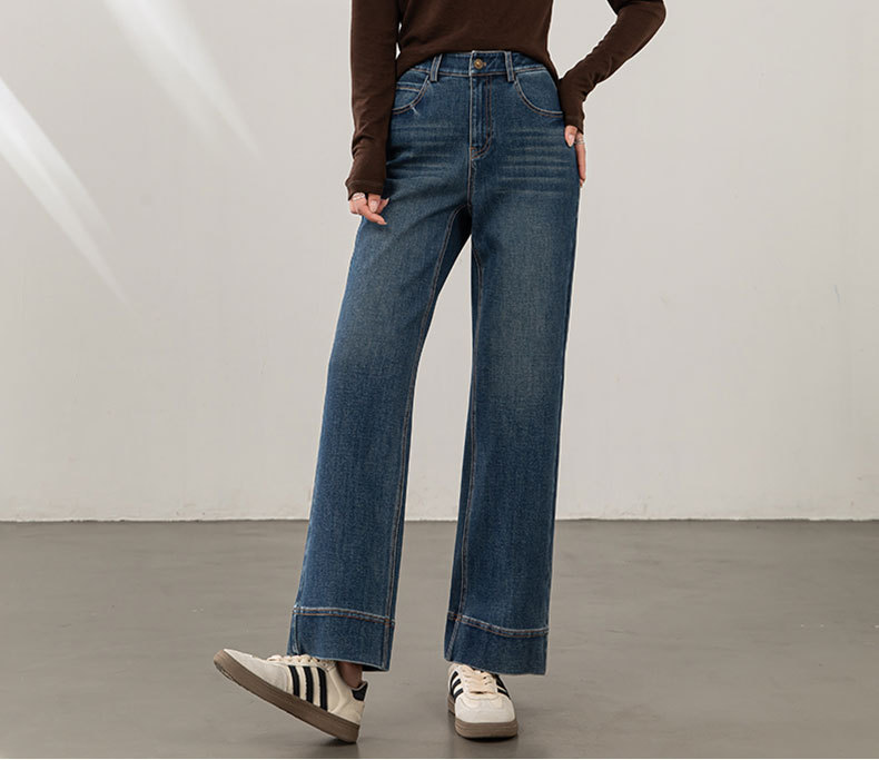 新款复古水洗高腰弹力直筒微喇叭牛仔阔腿拖地长裤女