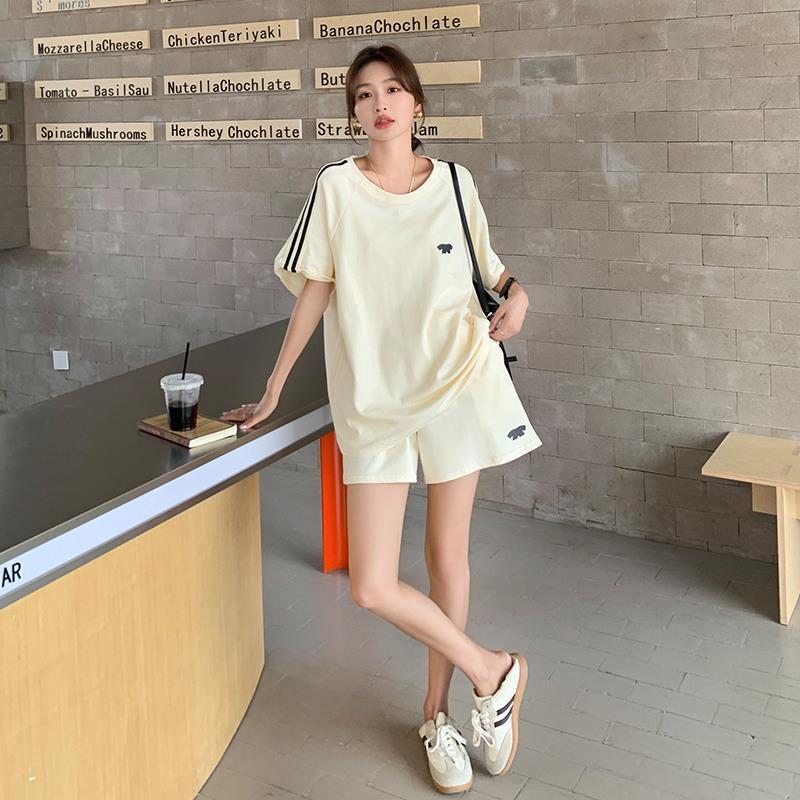 杏色运动休闲套装女新款洋气减龄宽松短袖T恤阔腿短裤两件套