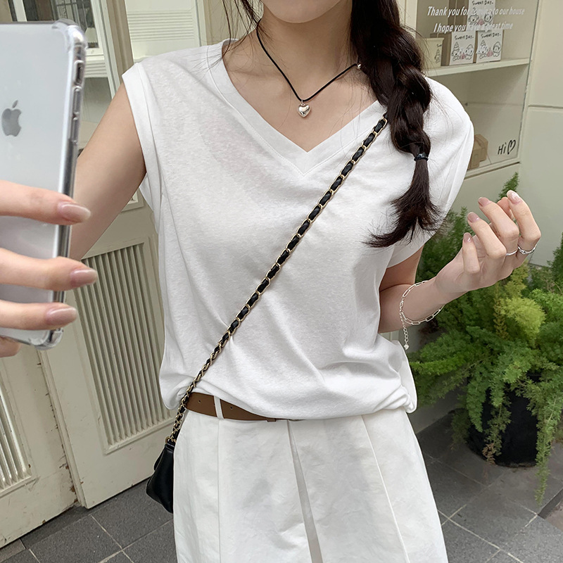 设计感小众V领卷边无袖T恤女春夏新款侧边褶皱休闲背心上衣潮