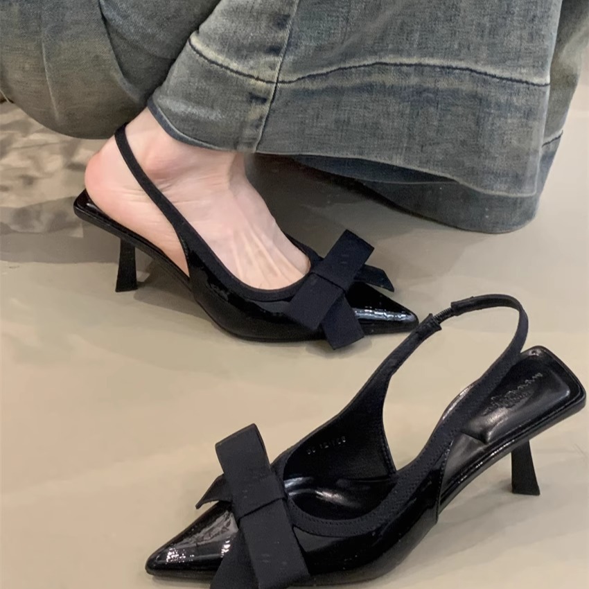 尖头高跟鞋女2025年春季法式气质优雅黑色蝴蝶结浅口细跟后空凉鞋