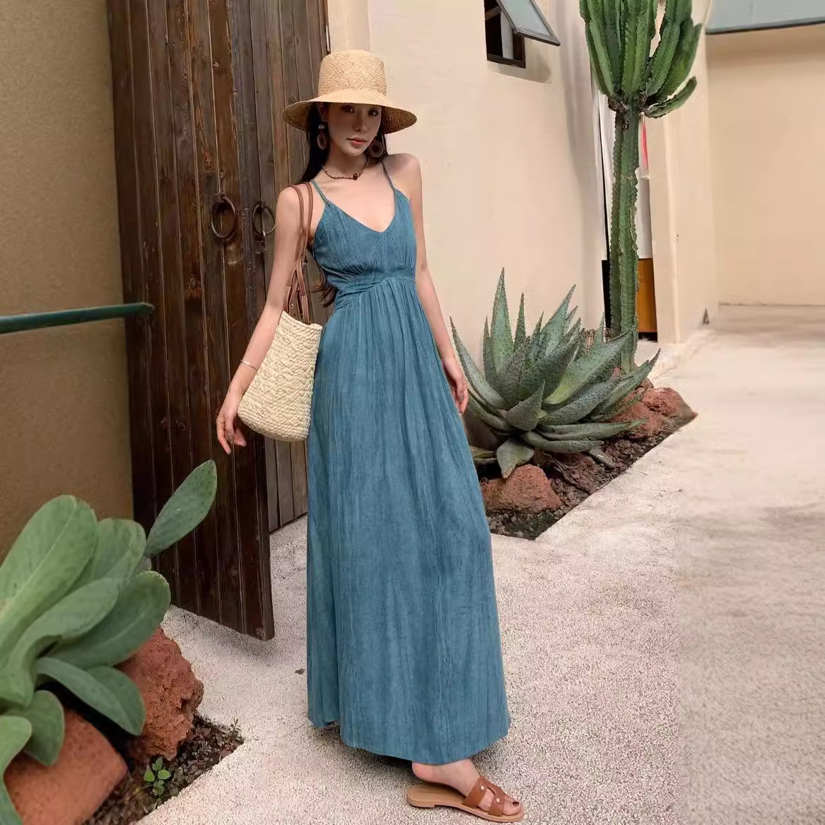 夏季亚麻V领三亚海边度假 吊带超修身连衣裙女