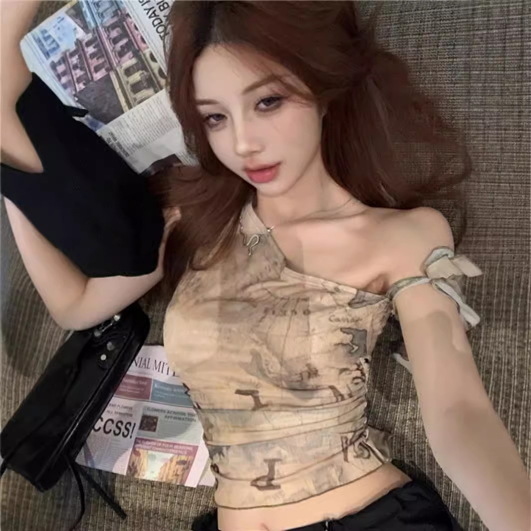 美式辣妹涂鸦印花斜肩T恤女夏季设计感性感无袖背心露肩短款上衣