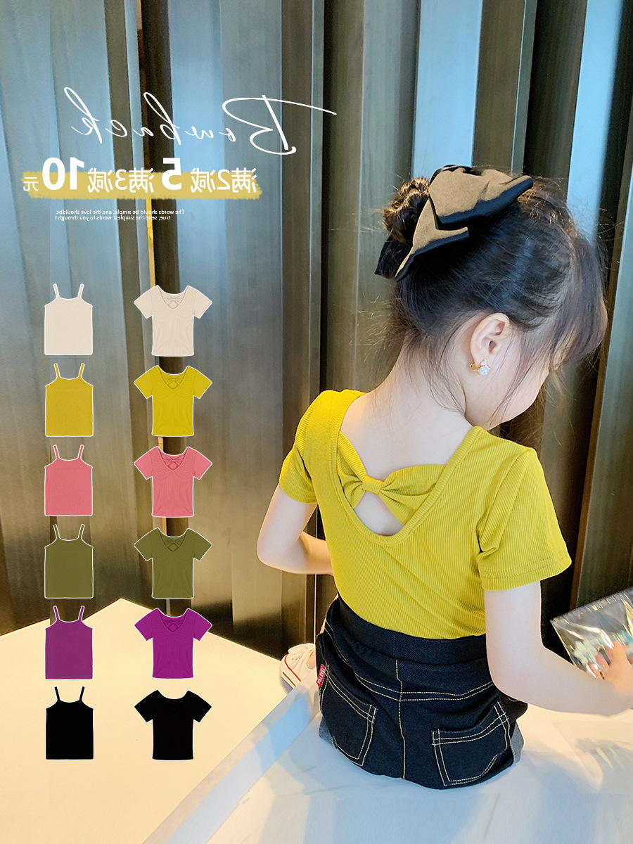 2025夏季新款短袖中小童圆领T恤女童吊带衫打底衫纯色后背蝴蝶结