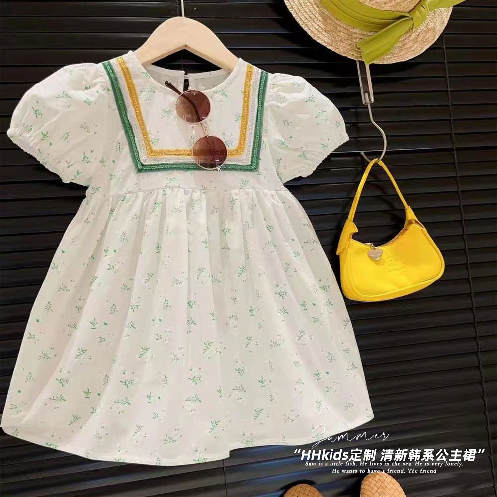 新品女童撞色大方领泡泡短袖收腰气质公主连衣裙2025中小童夏装