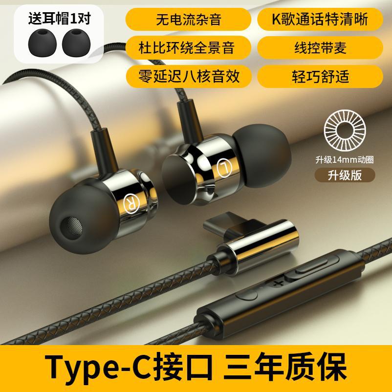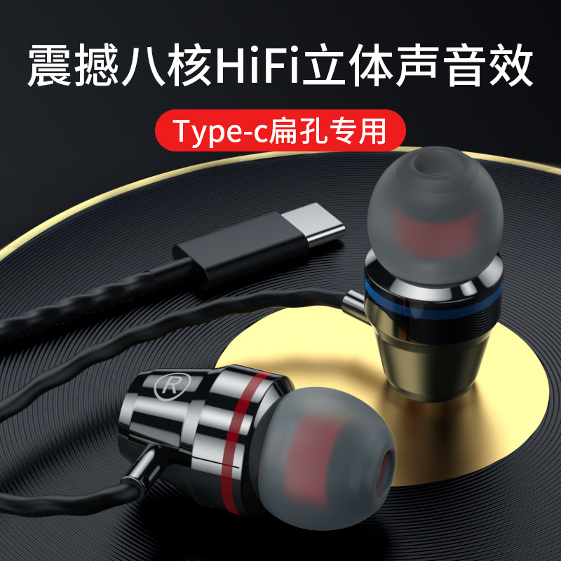 - 黑色【Type-C扁口】线控带麦★超强重低音★八核HIFI音效