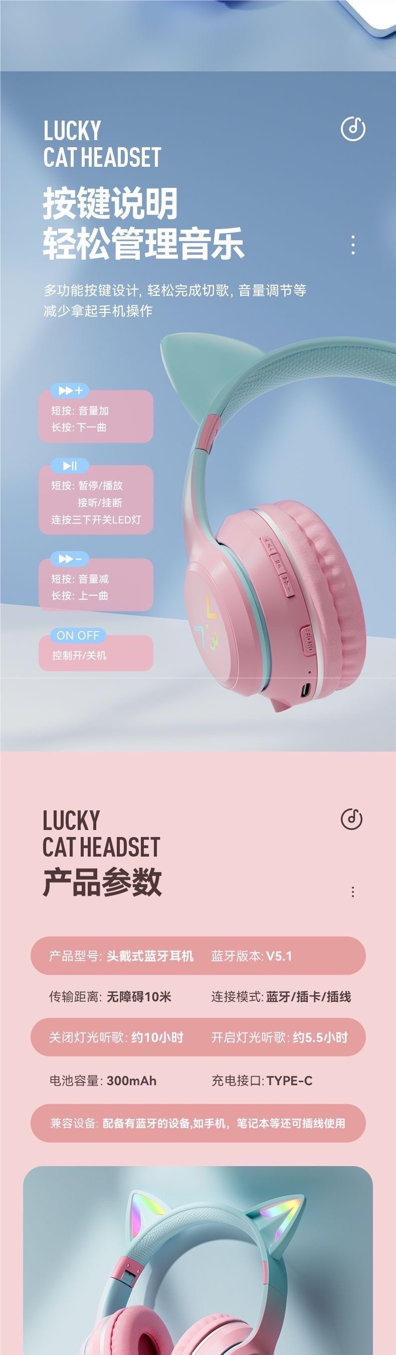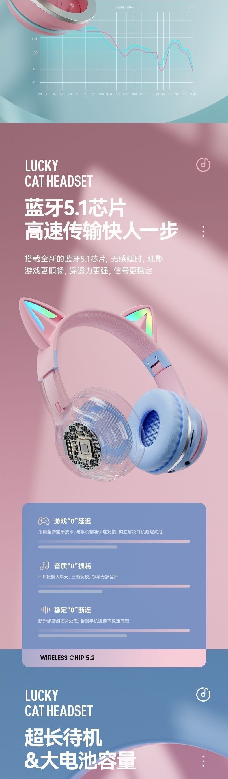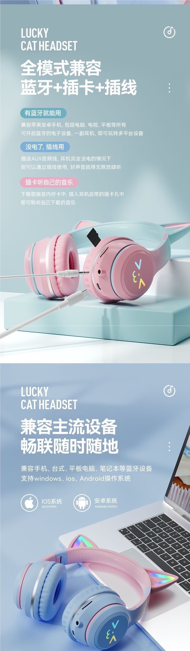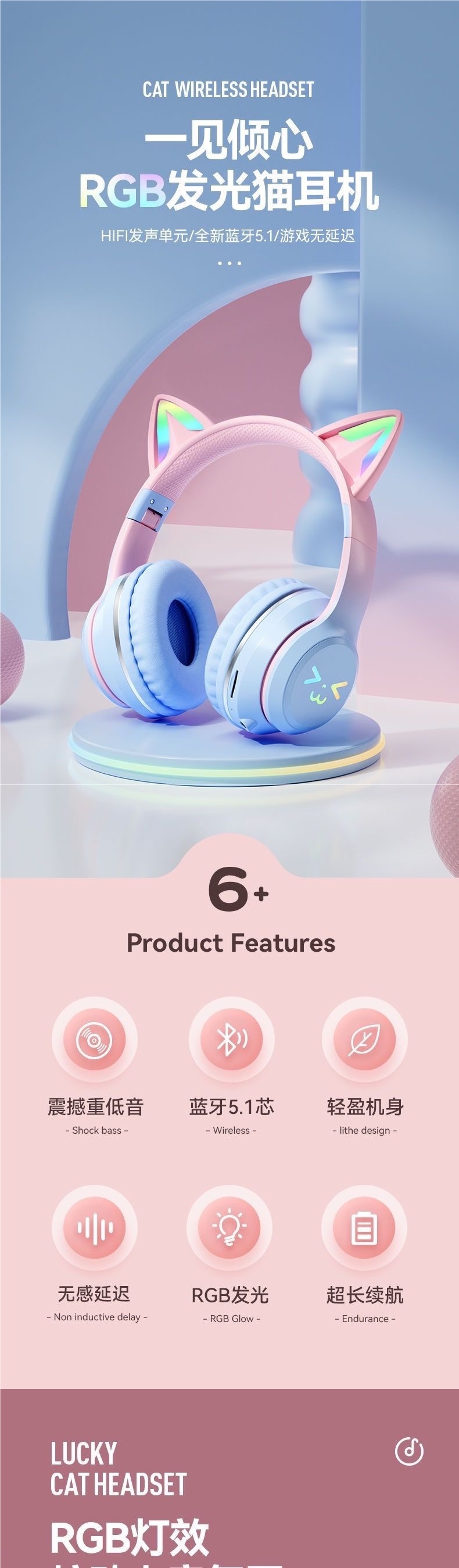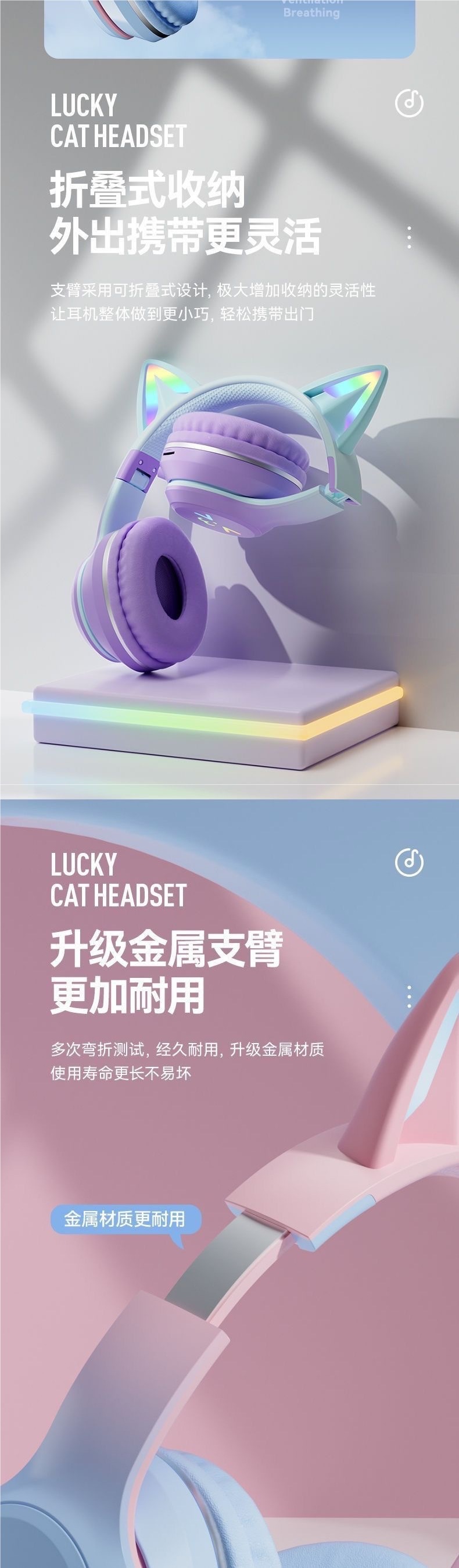 发光猫咪耳朵蓝牙耳机头戴式立体音高颜值无线电竞游戏听歌学习课