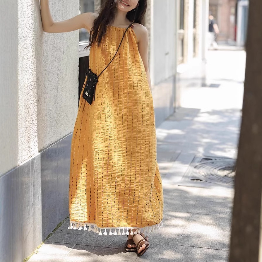 黄色流苏吊带连衣裙女夏季高级感超好看海边度假气质长裙子
