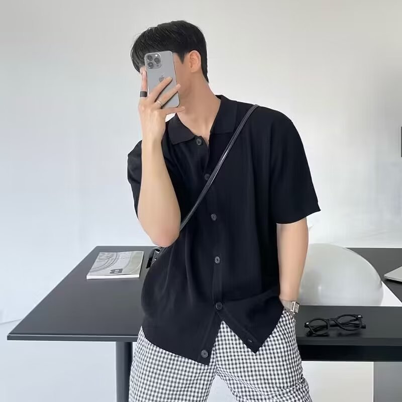 夏季高级翻领短袖开衫男士冰丝简约纽扣小众轻熟休闲风纯色半袖衫