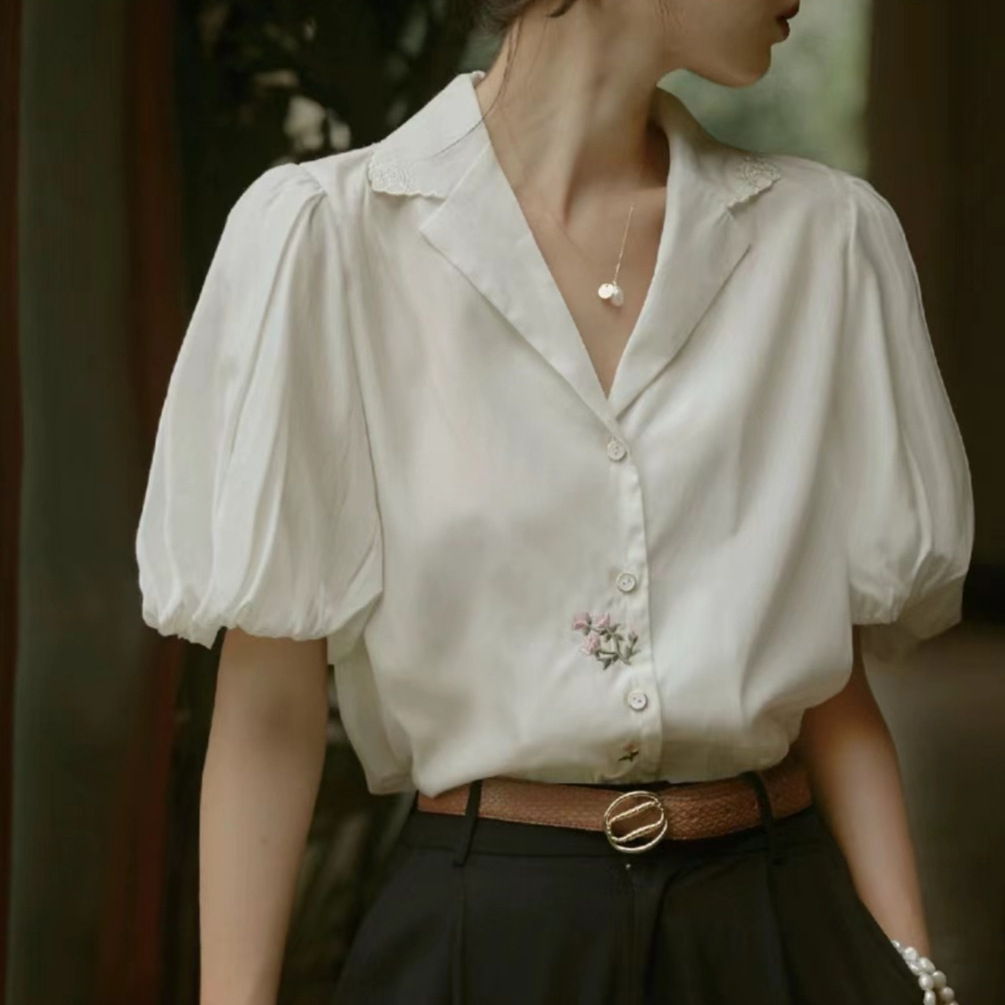法式小众别致白色泡泡袖衬衫女夏时尚复古花朵刺绣小花苞上衣薄款