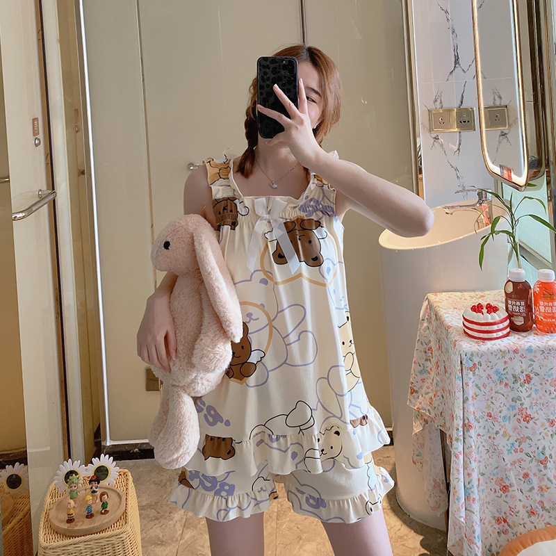 夏季韩版吊带背心睡衣女两件套休闲可爱卡通学生少女家居服