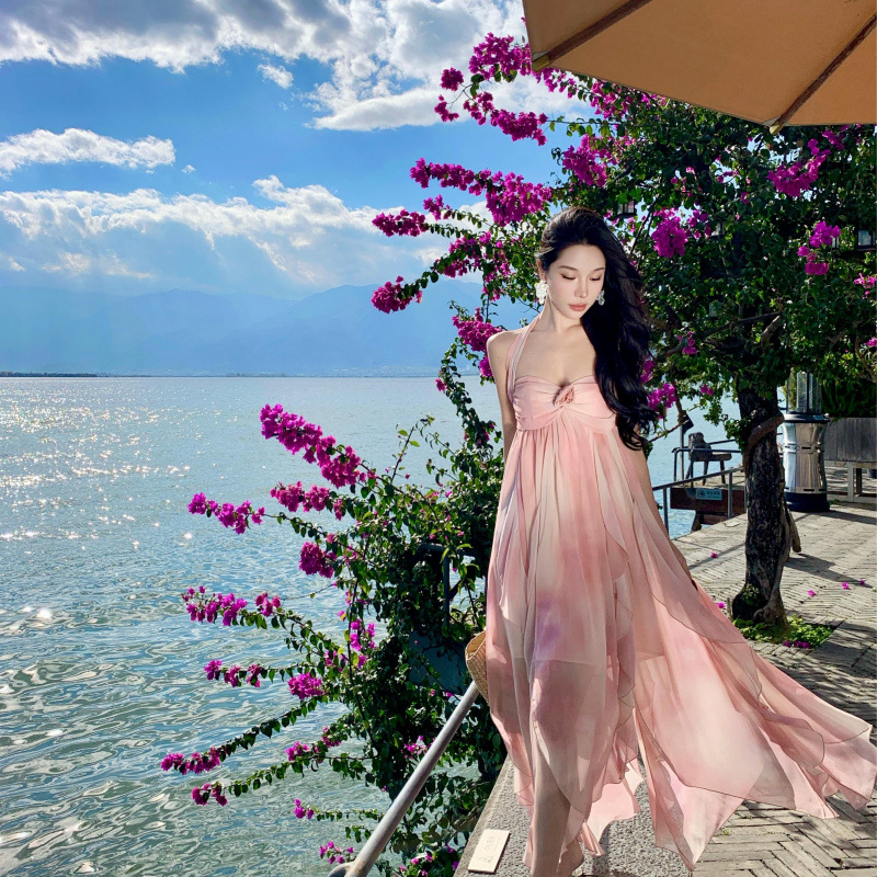 夏季海边度假挂脖粉色胸口立体玫瑰花长裙沙滩连衣裙海岛穿搭裙子