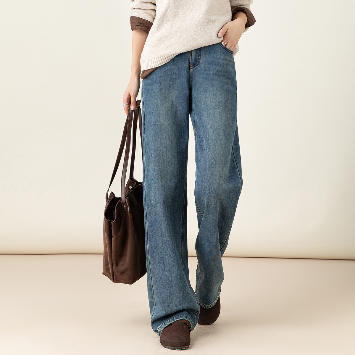 浅蓝加绒高腰阔腿牛仔裤女冬季新款显瘦窄版垂感百搭直筒裤子