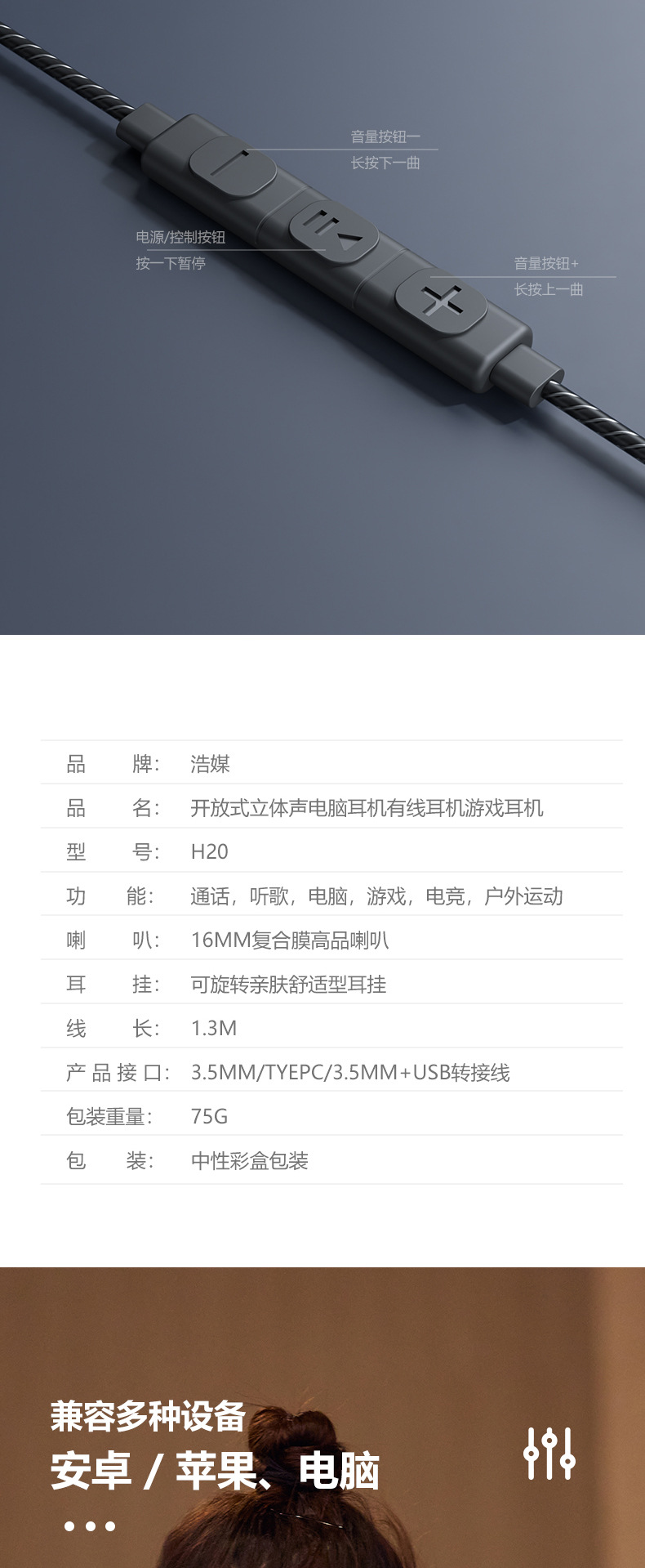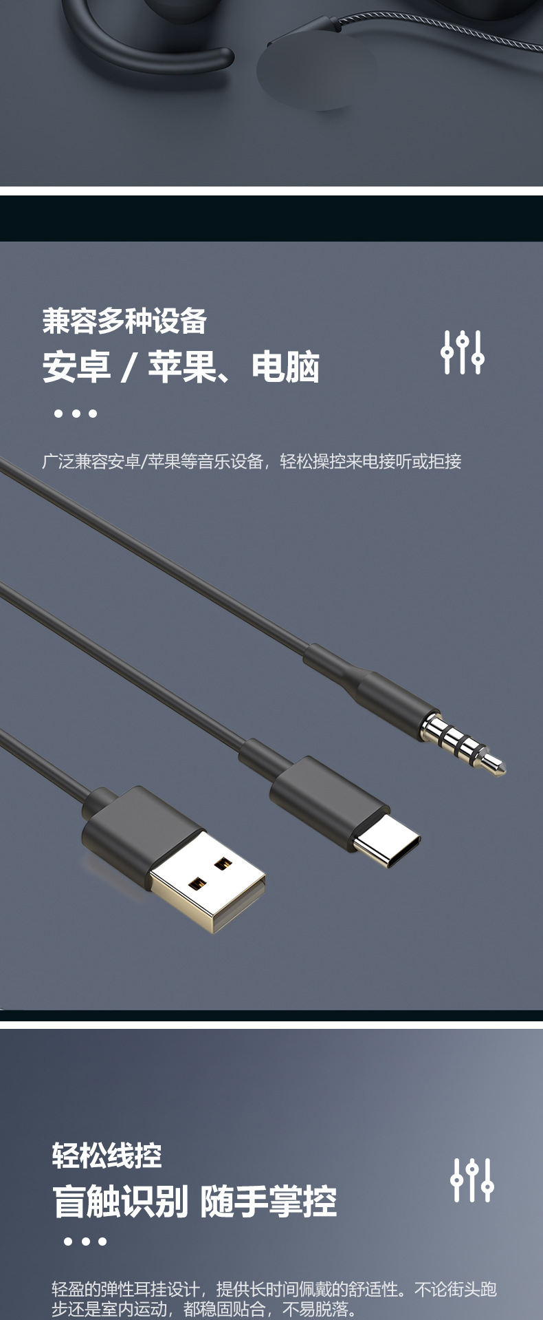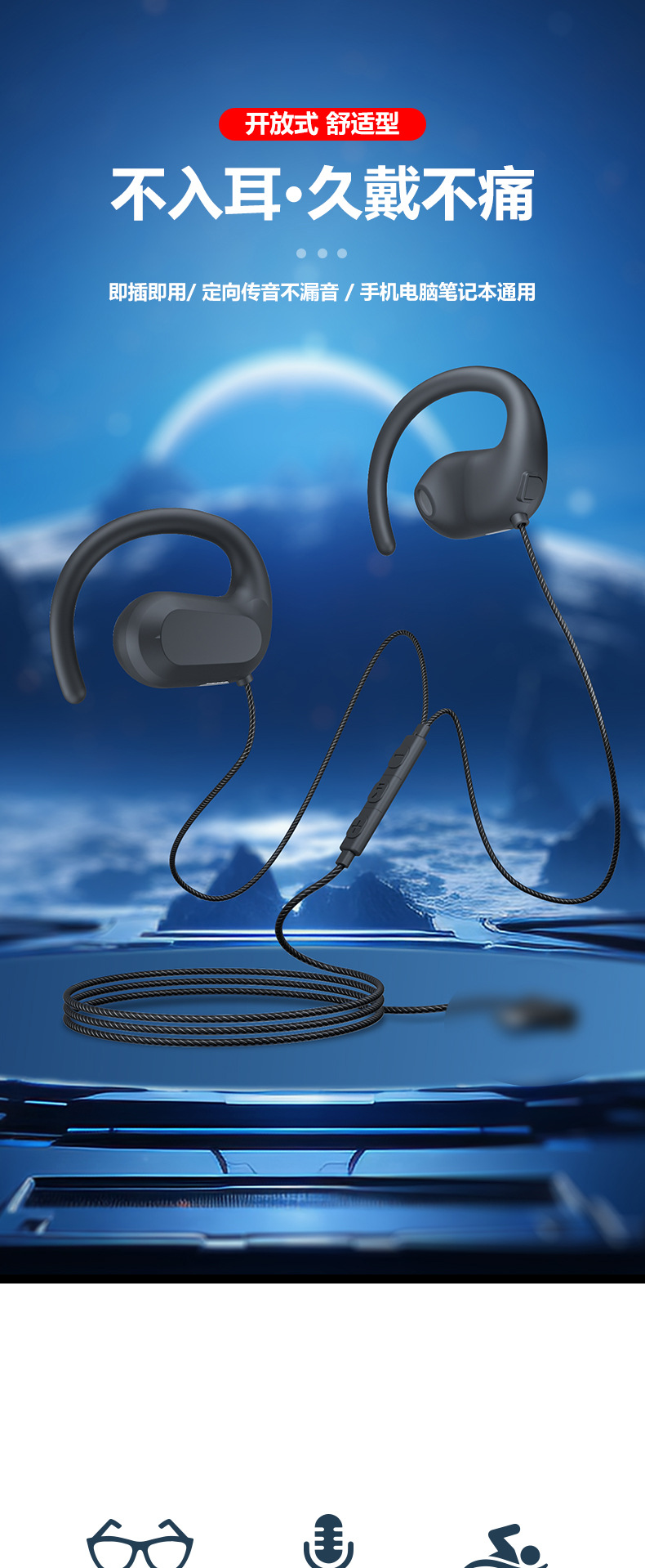 电脑有线耳机挂耳式不入耳运动跑步K歌会议网课音乐头戴式带麦