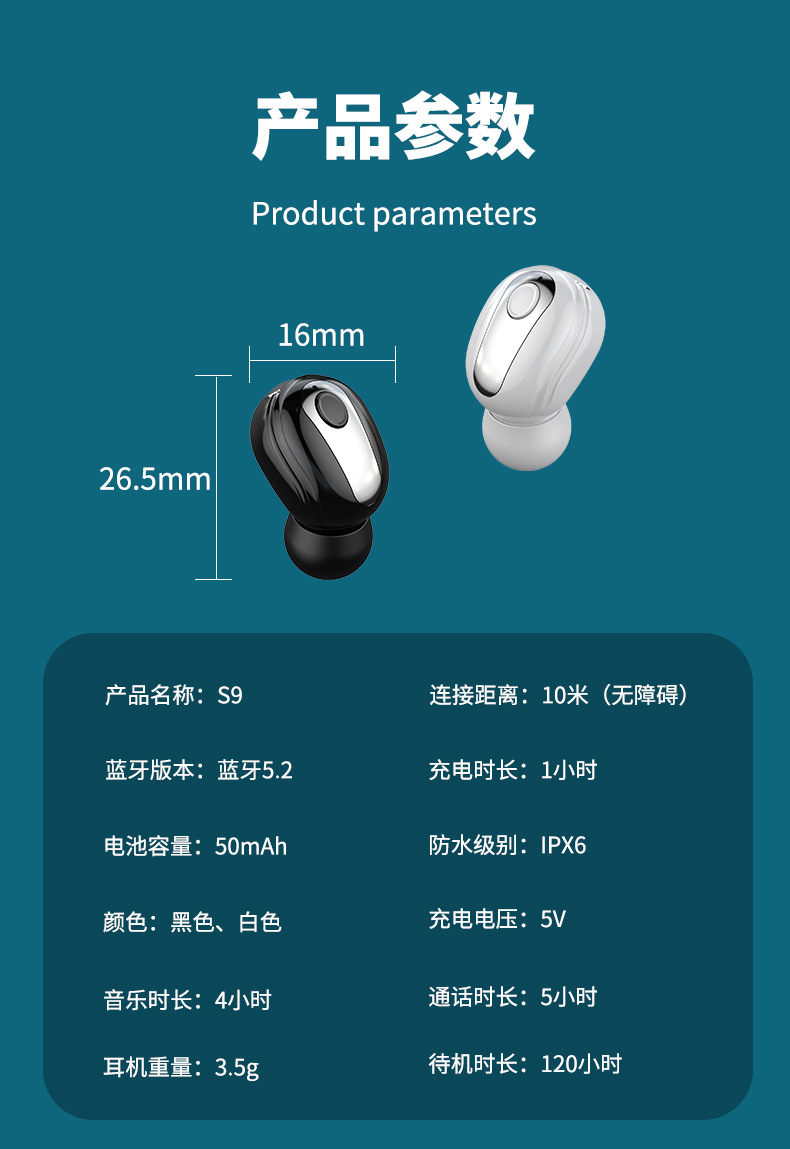 爆款S9无线蓝牙耳机迷你入耳式运动单耳蓝牙5.0立体声TWS耳机