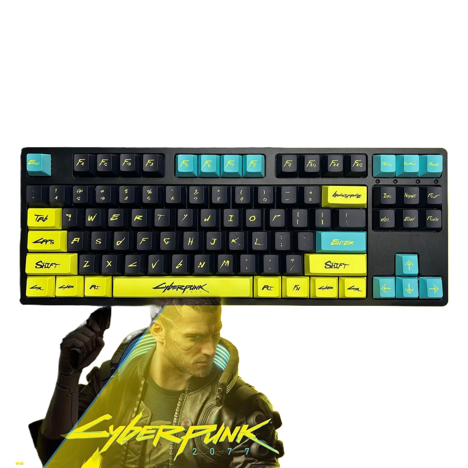- 茶轴~赛博朋克2077青色三模RGB机械键盘