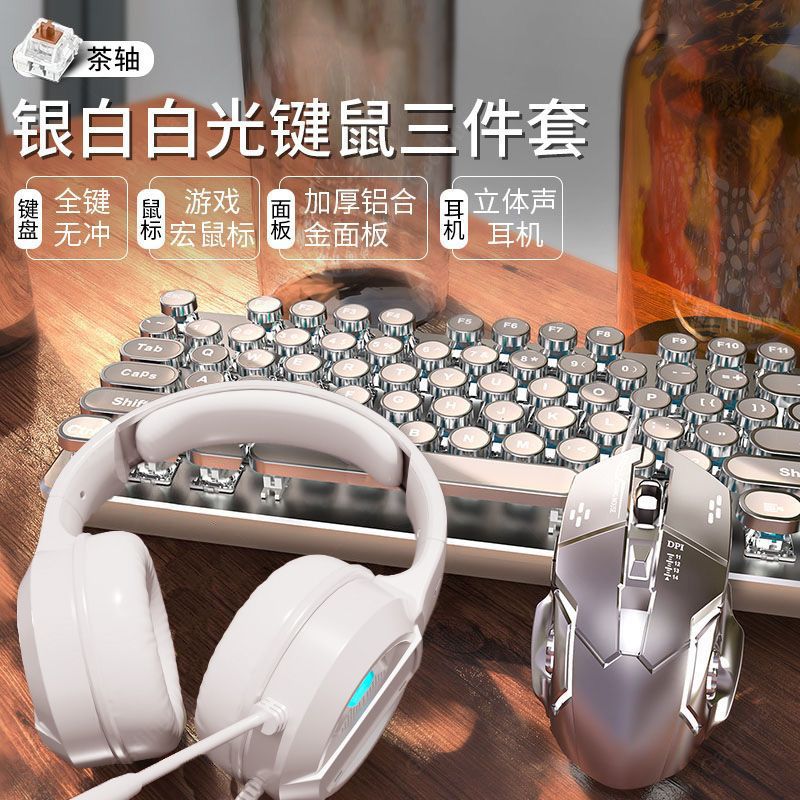 - 【升级版】白色白光-茶轴-真机械键盘+电竞鼠标+游戏耳机