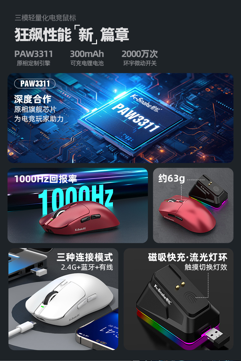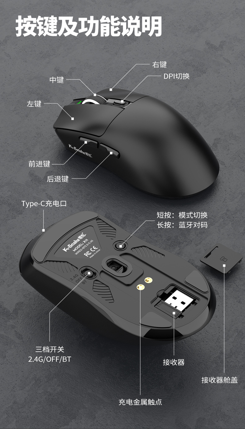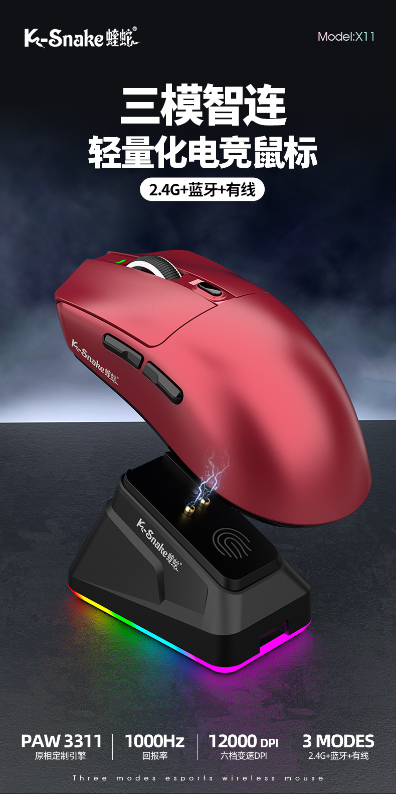 蝰蛇X11三模鼠标轻量化无线蓝牙2.4G鼠标带充电底座游戏电竞