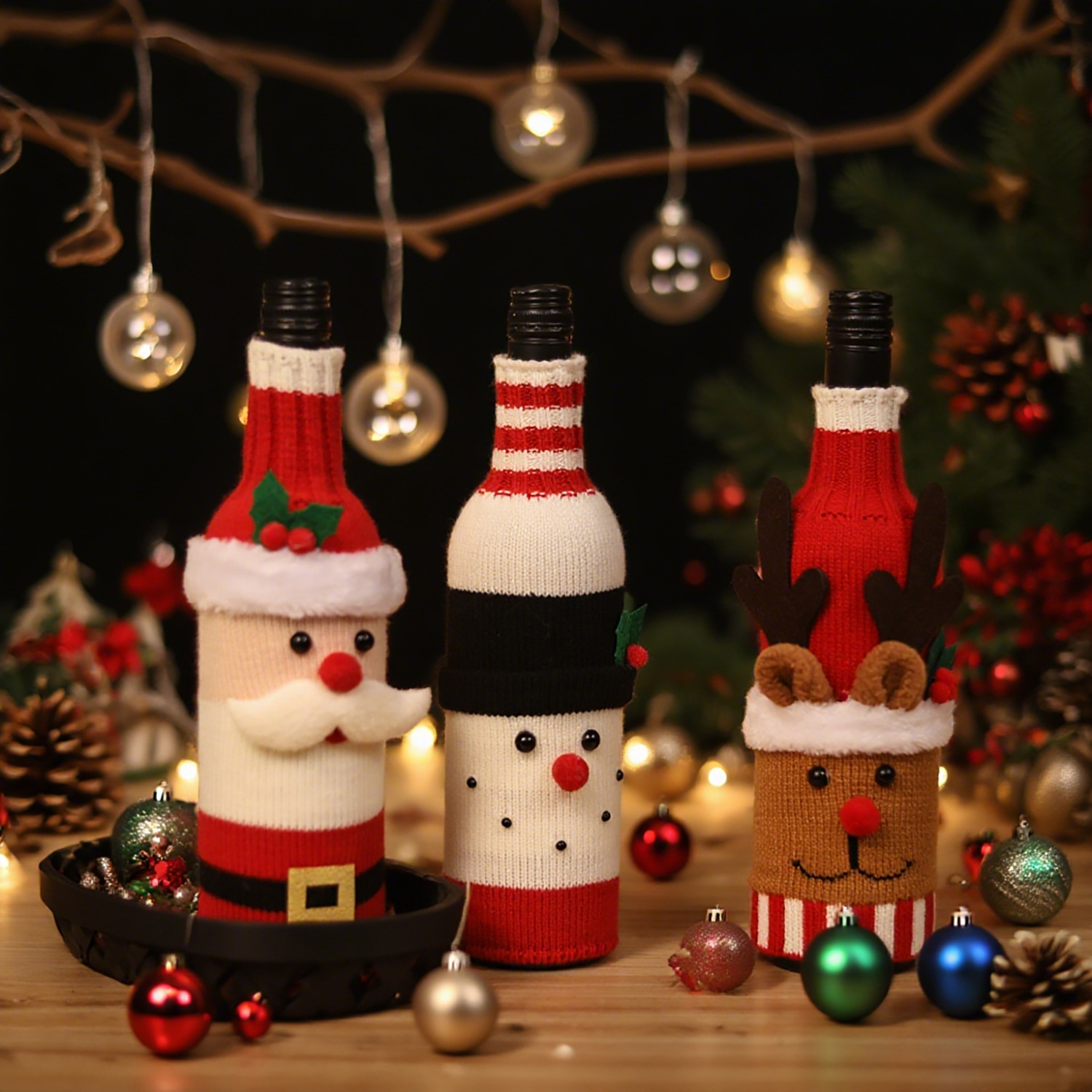 新品圣诞节装饰品针织布老人雪人麋鹿卡通酒瓶套家居餐桌装扮