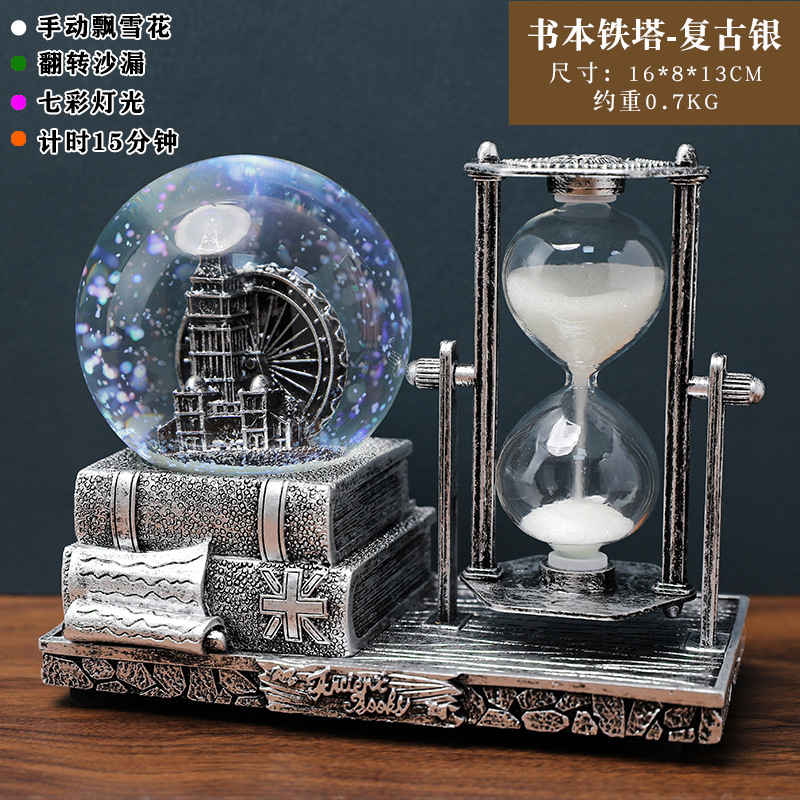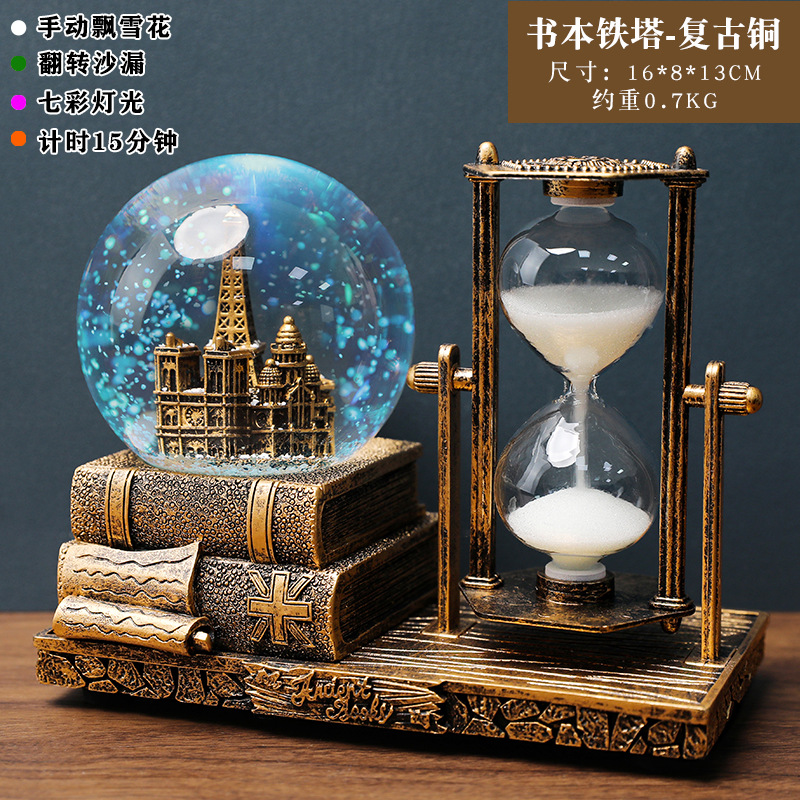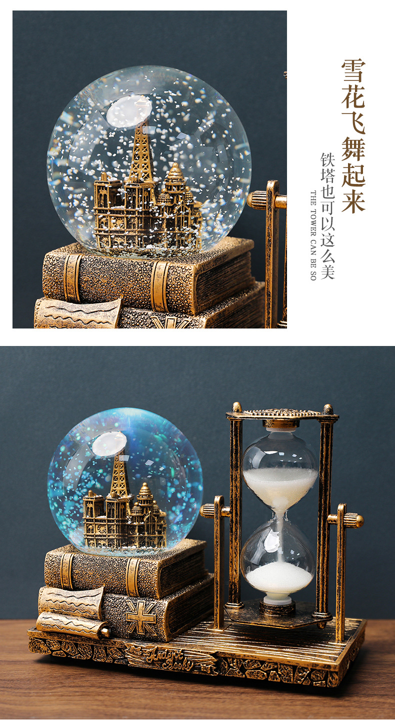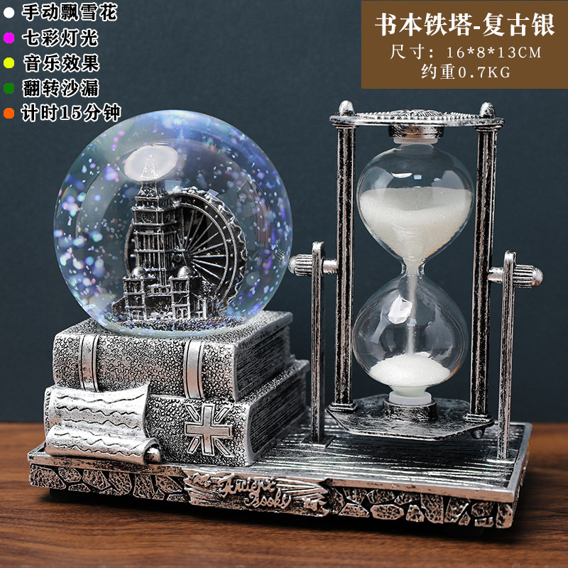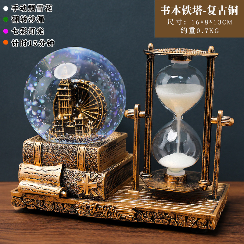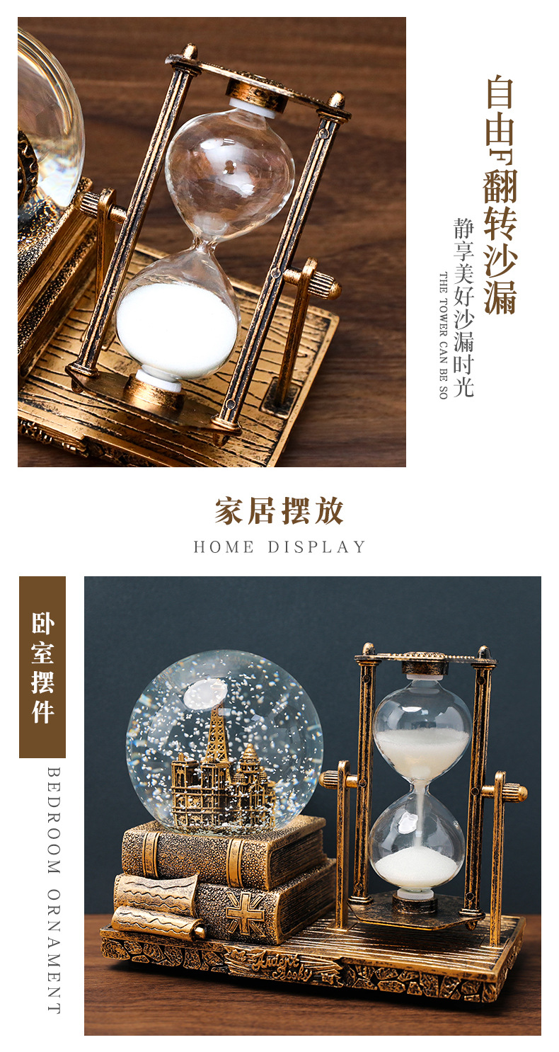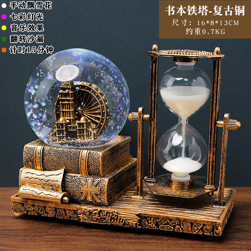 复古铁塔沙漏计时器水晶球八音盒发光桌面摆件学生毕业圣诞节礼物