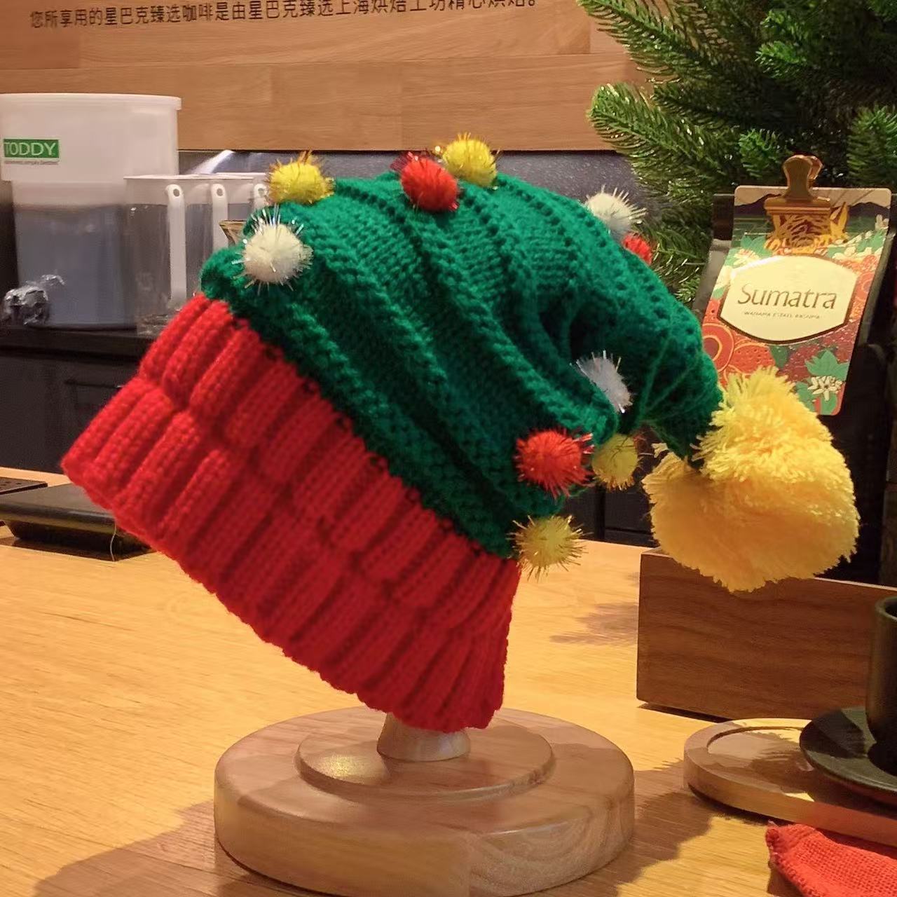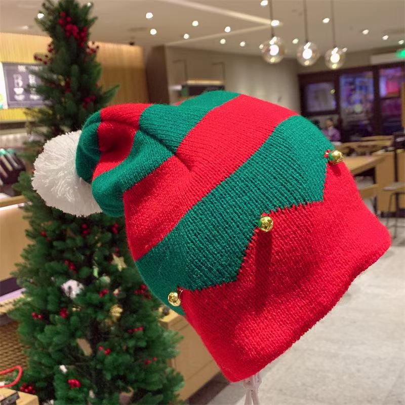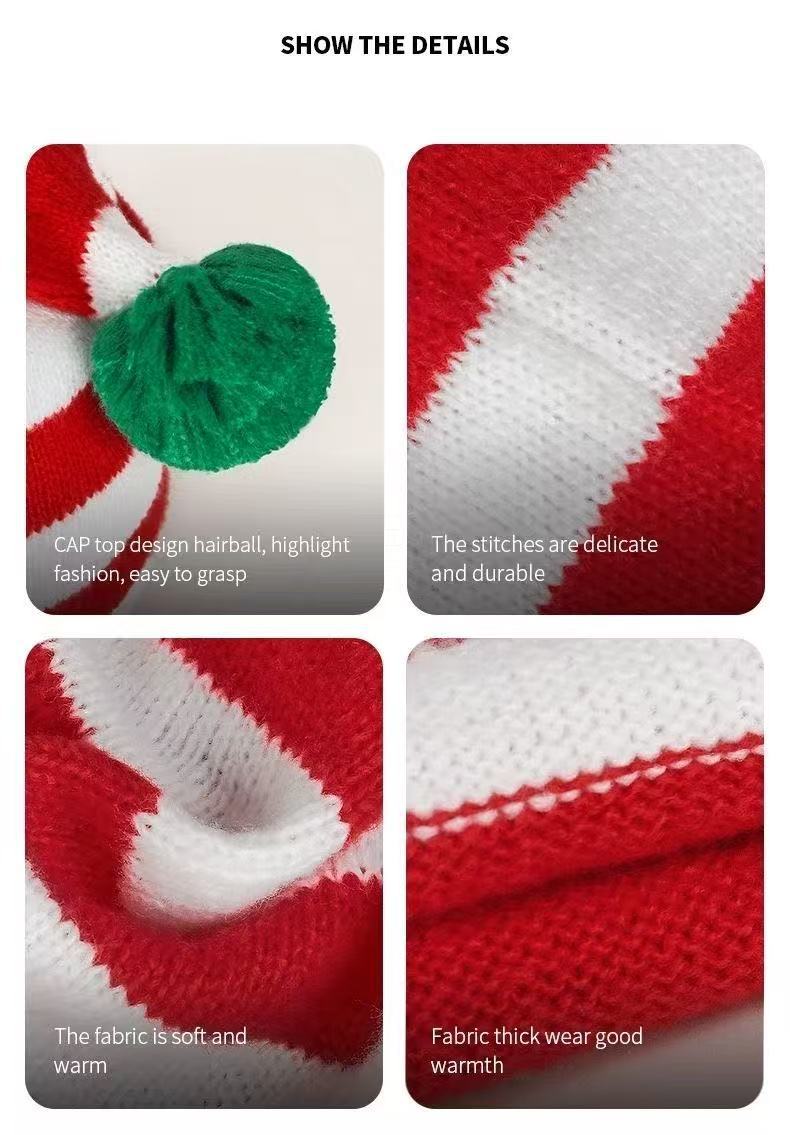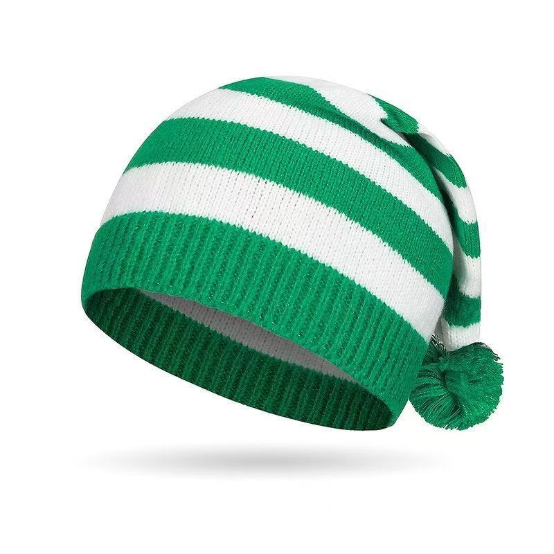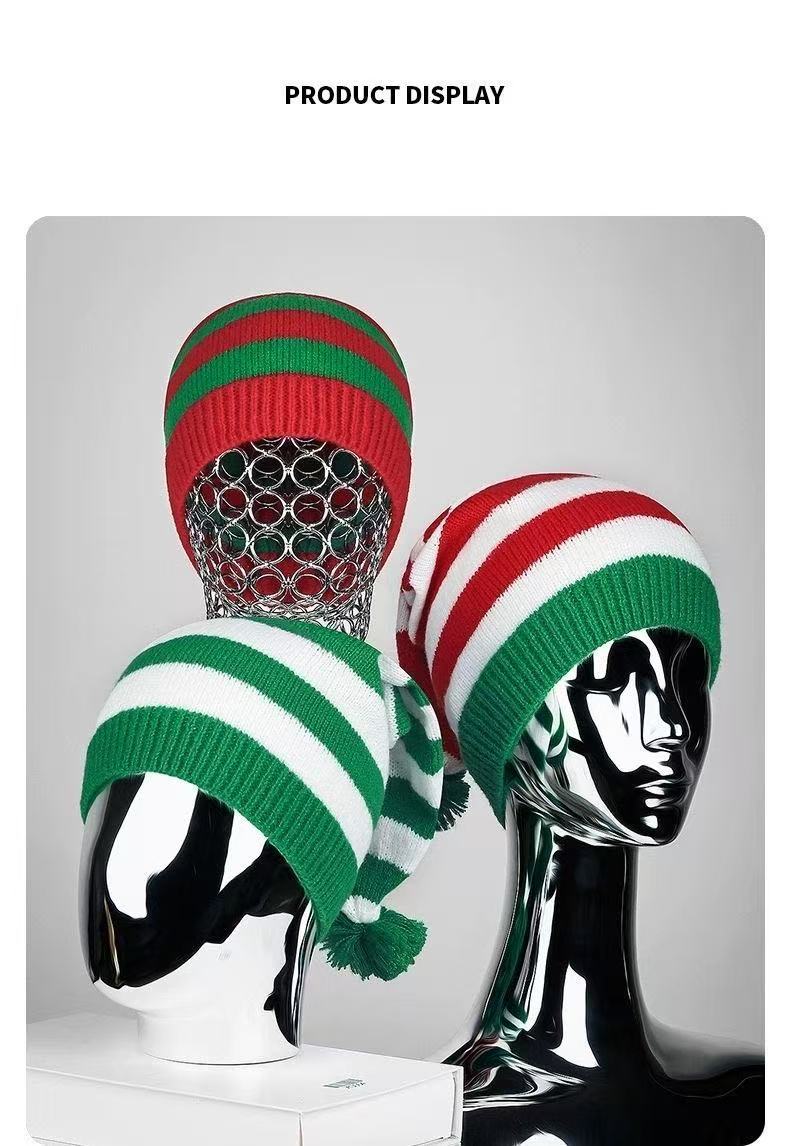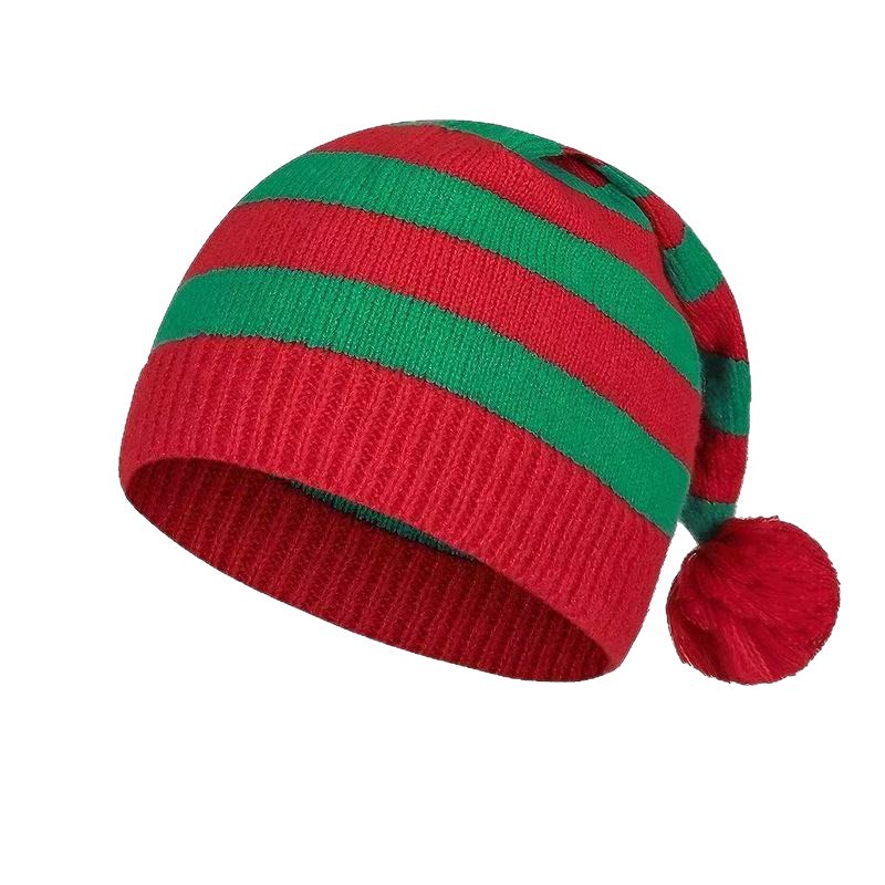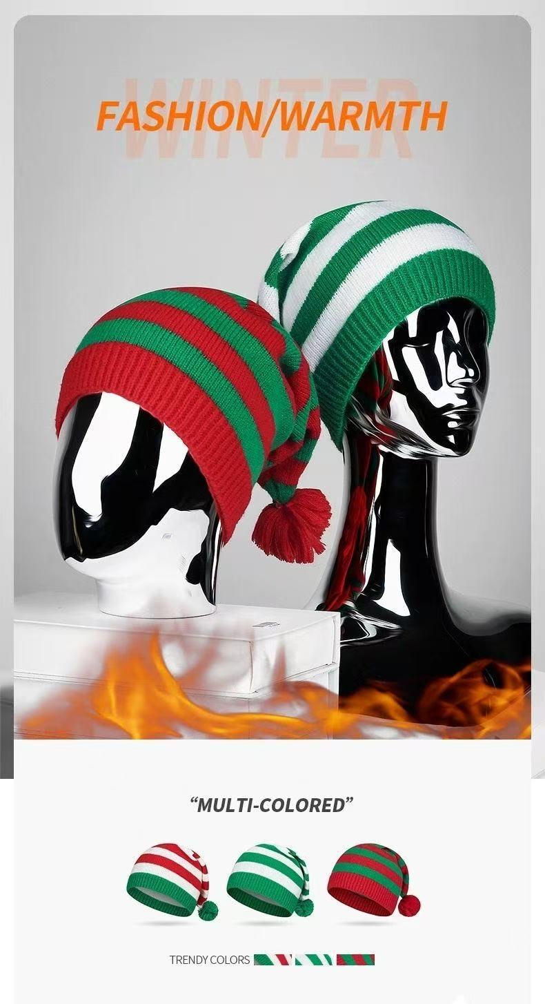 礼品圣诞帽针织帽红绿条纹毛球长尾帽欧美圣诞帽老人帽