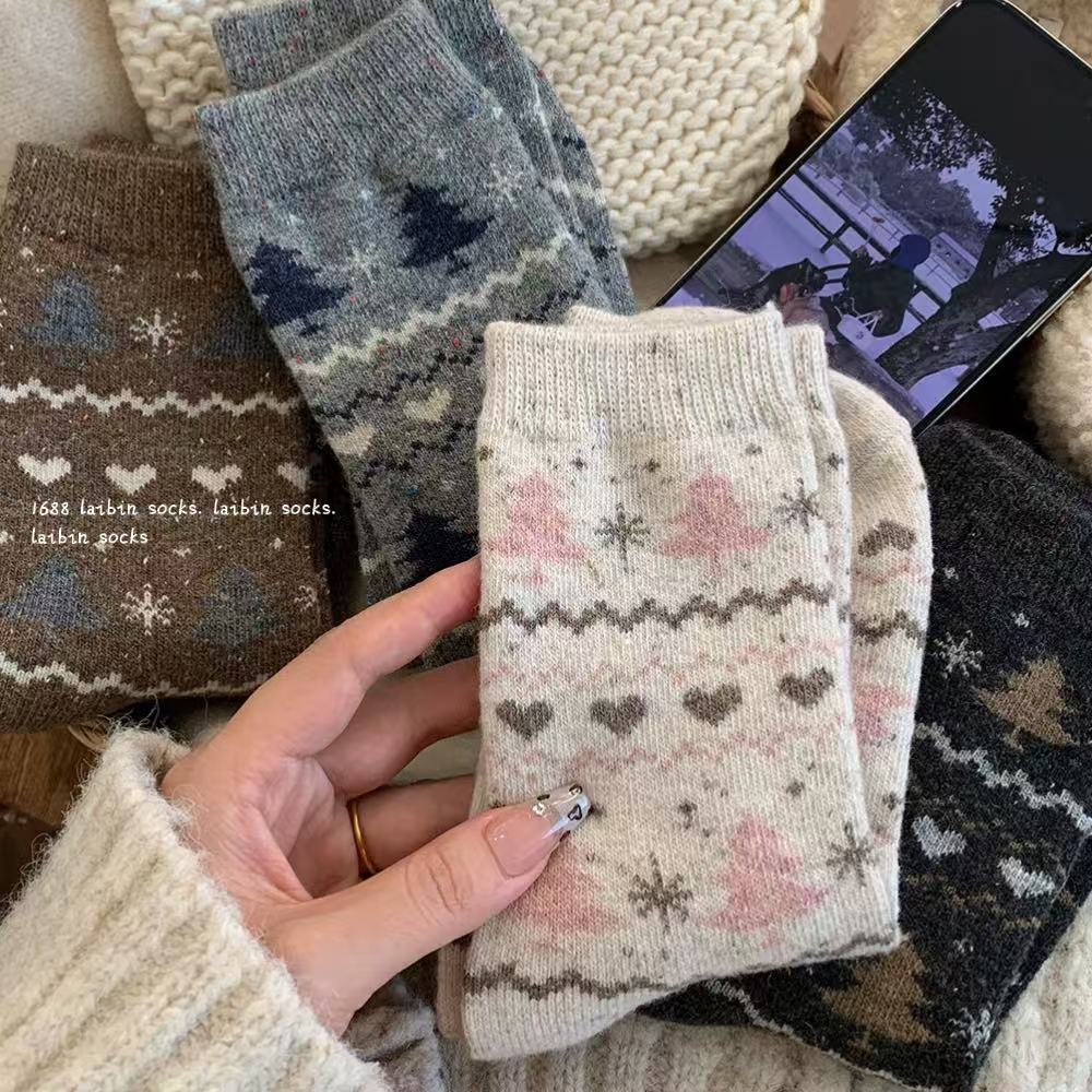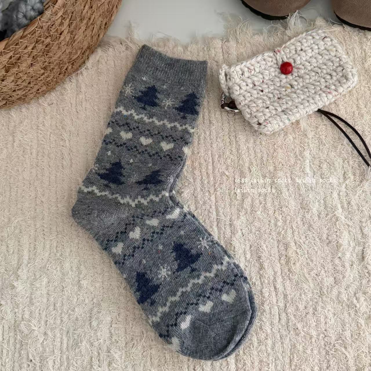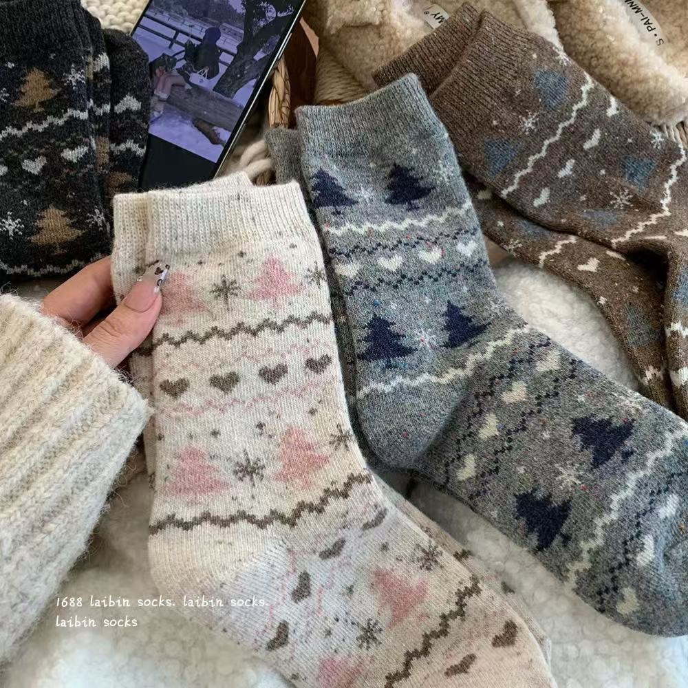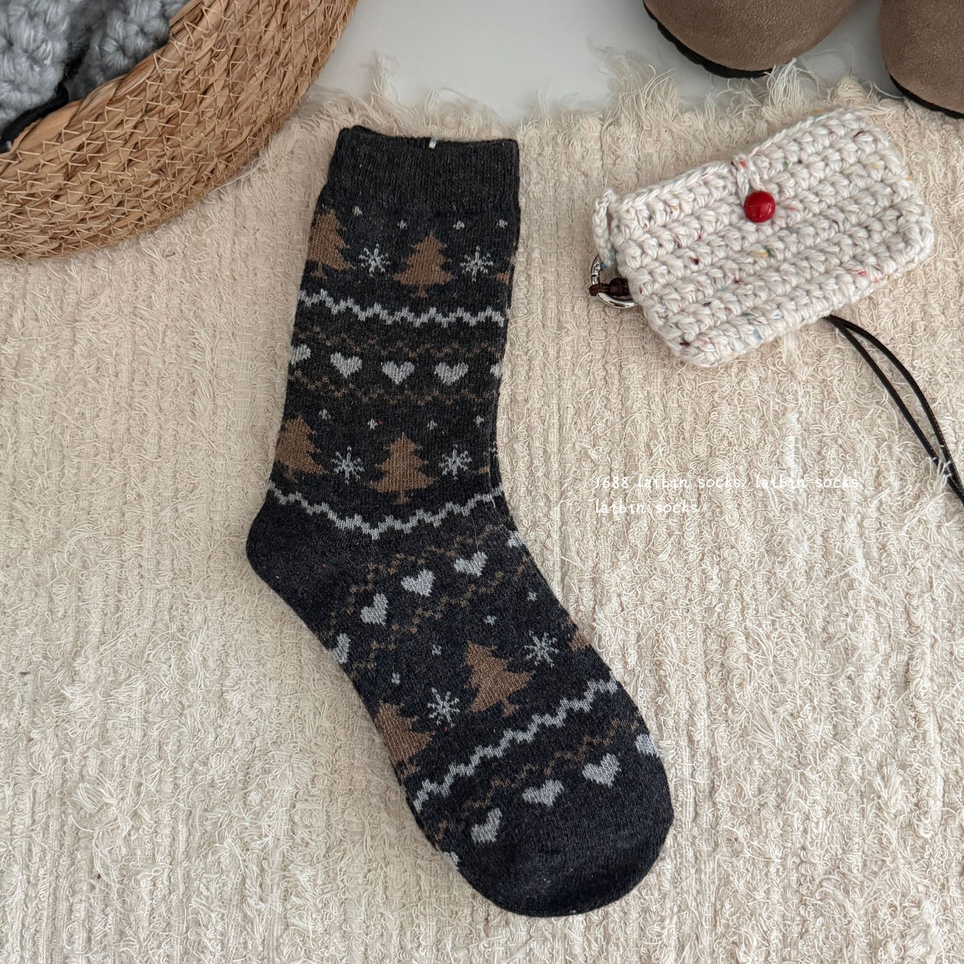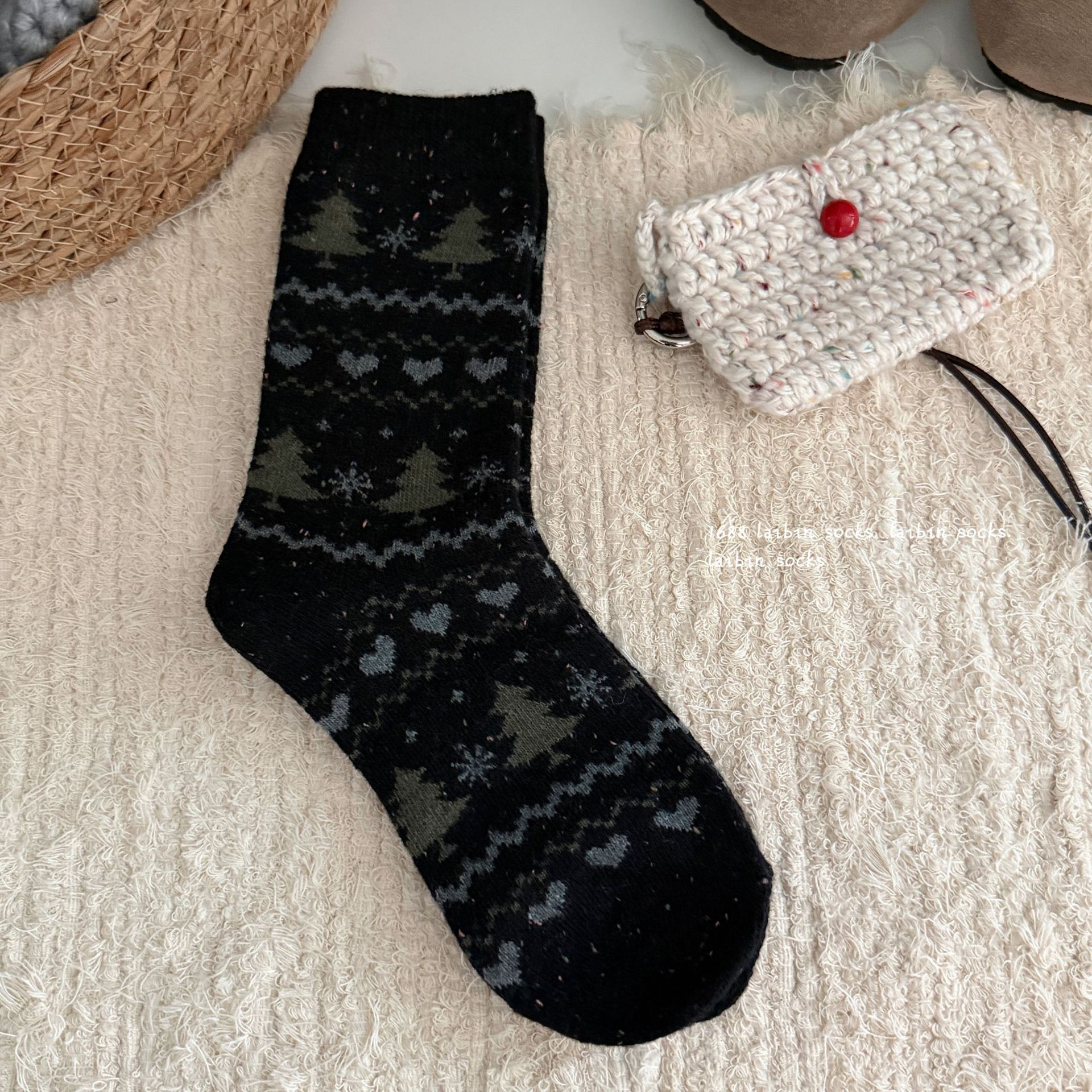 保暖袜子女费尔岛羊毛复古点子纱秋冬季袜子女中筒袜圣诞树厚袜子